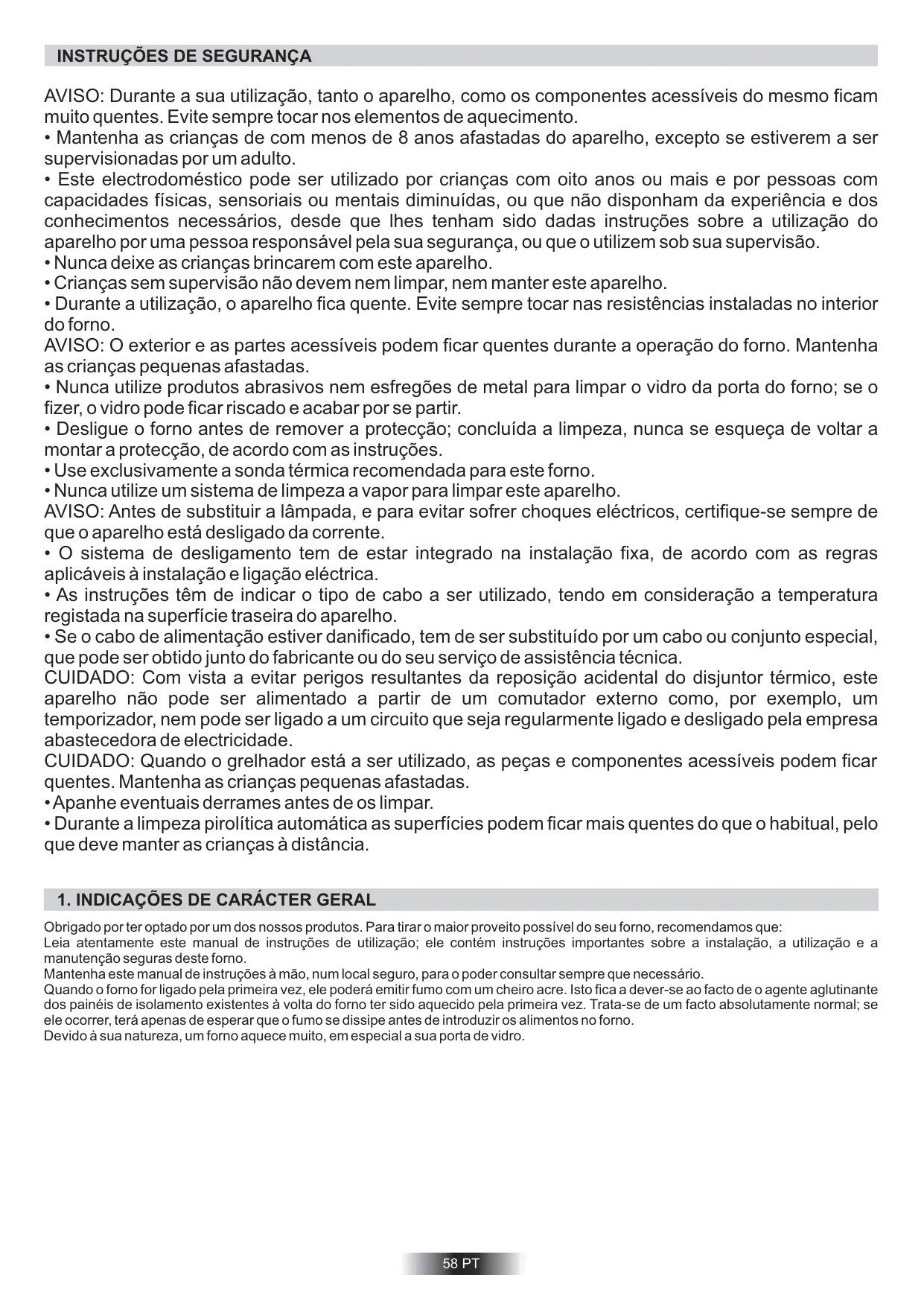 Obrigado por ter optado por um dos nossos produtos. Para tirar o maior proveito possível do seu forno, recomendamos que: Leia atentamente este manual de instruções de utilização; ele contém instruções importantes sobre a instalação, a utilização e a manutenção seguras deste forno. Mantenha este manual de instruções à mão, num local seguro, para o poder consultar sempre que necessário. Quando o forno for ligado pela primeira vez, ele poderá emitir fumo com um cheiro acre. Isto fica a dever-se ao facto de o agente aglutinante dos painéis de isolamento existentes à volta do forno ter sido aquecido pela primeira vez. Trata-se de um facto absolutamente normal; se ele ocorrer, terá apenas de esperar que o fumo se dissipe antes de introduzir os alimentos no forno. Devido à sua natureza, um forno aquece muito, em especial a sua porta de vidro. 58 PT