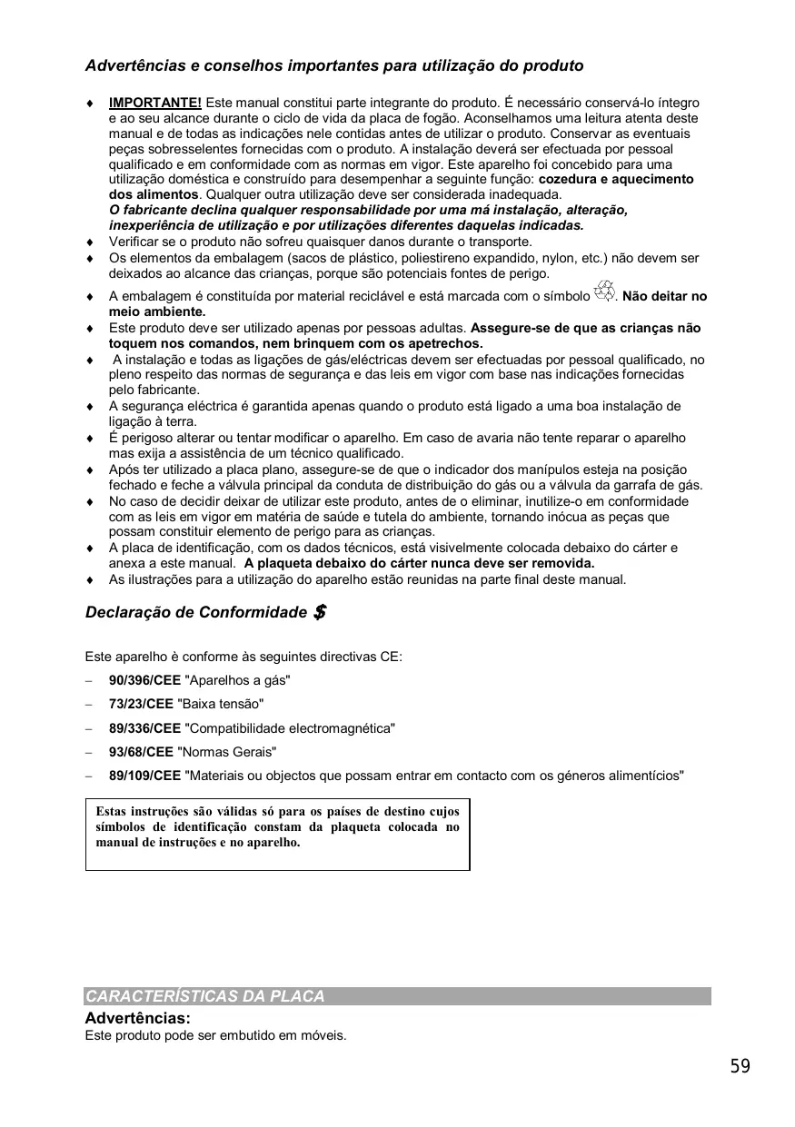 IMPORTANTE! Este manual constitui parte integrante do produto. É necessário conservá-lo íntegro e ao seu alcance durante o ciclo de vida da placa de fogão. Aconselhamos uma leitura atenta deste manual e de todas as indicações nele contidas antes de utilizar o produto. Conservar as eventuais peças sobresselentes fornecidas com o produto. A instalação deverá ser efectuada por pessoal qualificado e em conformidade com as normas em vigor. Este aparelho foi concebido para uma utilização doméstica e construído para desempenhar a seguinte função: cozedura e aquecimento dos alimentos. Qualquer outra utilização deve ser considerada inadequada. O fabricante declina qualquer responsabilidade por uma má instalação, alteração, inexperiência de utilização e por utilizações diferentes daquelas indicadas. Verificar se o produto não sofreu quaisquer danos durante o transporte. Os elementos da embalagem (sacos de plástico, poliestireno expandido, nylon, etc.) não devem ser deixados ao alcance das crianças, porque são potenciais fontes de perigo. . Não deitar no A embalagem é constituída por material reciclável e está marcada com o símbolo meio ambiente. Este produto deve ser utilizado apenas por pessoas adultas. Assegure-se de que as crianças não toquem nos comandos, nem brinquem com os apetrechos. A instalação e todas as ligações de gás/eléctricas devem ser efectuadas por pessoal qualificado, no pleno respeito das normas de segurança e das leis em vigor com base nas indicações fornecidas pelo fabricante. A segurança eléctrica é garantida apenas quando o produto está ligado a uma boa instalação de ligação à terra. É perigoso alterar ou tentar modificar o aparelho. Em caso de avaria não tente reparar o aparelho mas exija a assistência de um técnico qualificado. Após ter utilizado a placa plano, assegure-se de que o indicador dos manípulos esteja na posição fechado e feche a válvula principal da conduta de distribuição do gás ou a válvula da garrafa de gás. No caso de decidir deixar de utilizar este produto, antes de o eliminar, inutilize-o em conformidade com as leis em vigor em matéria de saúde e tutela do ambiente, tornando inócua as peças que possam constituir elemento de perigo para as crianças. A placa de identificação, com os dados técnicos, está visivelmente colocada debaixo do cárter e anexa a este manual. A plaqueta debaixo do cárter nunca deve ser removida. As ilustrações para a utilização do aparelho estão reunidas na parte final deste manual. Declaração de Conformidade Este aparelho è conforme às seguintes directivas CE: