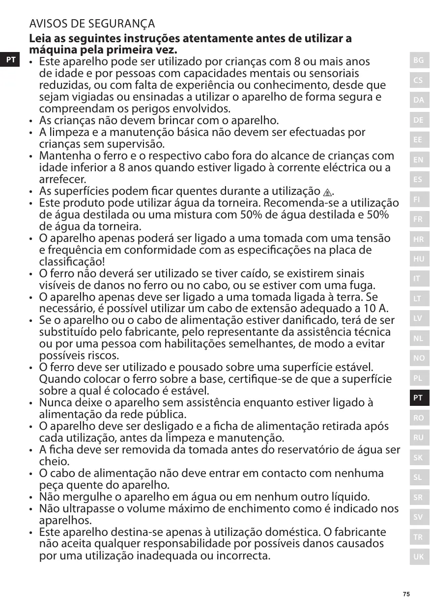 PT Avisos de segurança Leia as seguintes instruções atentamente antes de utilizar a máquina pela primeira vez. • Este aparelho pode ser utilizado por crianças com 8 ou mais anos de idade e por pessoas com capacidades mentais ou sensoriais reduzidas, ou com falta de experiência ou conhecimento, desde que sejam vigiadas ou ensinadas a utilizar o aparelho de forma segura e compreendam os perigos envolvidos. • As crianças não devem brincar com o aparelho. • A limpeza e a manutenção básica não devem ser efectuadas por crianças sem supervisão. • Mantenha o ferro e o respectivo cabo fora do alcance de crianças com idade inferior a 8 anos quando estiver ligado à corrente eléctrica ou a arrefecer. • As superfícies podem ficar quentes durante a utilização . • Este produto pode utilizar água da torneira. Recomenda-se a utilização de água destilada ou uma mistura com 50% de água destilada e 50% de água da torneira. • O aparelho apenas poderá ser ligado a uma tomada com uma tensão e frequência em conformidade com as especificações na placa de classificação! • O ferro não deverá ser utilizado se tiver caído, se existirem sinais visíveis de danos no ferro ou no cabo, ou se estiver com uma fuga. • O aparelho apenas deve ser ligado a uma tomada ligada à terra. Se necessário, é possível utilizar um cabo de extensão adequado a 10 A. • Se o aparelho ou o cabo de alimentação estiver danificado, terá de ser substituído pelo fabricante, pelo representante da assistência técnica ou por uma pessoa com habilitações semelhantes, de modo a evitar possíveis riscos. • O ferro deve ser utilizado e pousado sobre uma superfície estável. Quando colocar o ferro sobre a base, certifique-se de que a superfície sobre a qual é colocado é estável. • Nunca deixe o aparelho sem assistência enquanto estiver ligado à alimentação da rede pública. • O aparelho deve ser desligado e a ficha de alimentação retirada após cada utilização, antes da limpeza e manutenção. • A ficha deve ser removida da tomada antes do reservatório de água ser cheio. • O cabo de alimentação não deve entrar em contacto com nenhuma peça quente do aparelho. • Não mergulhe o aparelho em água ou em nenhum outro líquido. • Não ultrapasse o volume máximo de enchimento como é indicado nos aparelhos. • Este aparelho destina-se apenas à utilização doméstica. O fabricante não aceita qualquer responsabilidade por possíveis danos causados por uma utilização inadequada ou incorrecta.