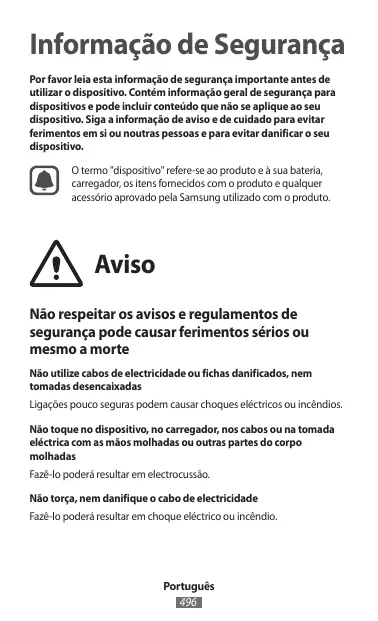 Informação de Segurança Por favor leia esta informação de segurança importante antes de utilizar o dispositivo. Contém informação geral de segurança para dispositivos e pode incluir conteúdo que não se aplique ao seu dispositivo. Siga a informação de aviso e de cuidado para evitar ferimentos em si ou noutras pessoas e para evitar danificar o seu dispositivo. O termo "dispositivo" refere-se ao produto e à sua bateria, carregador, os itens fornecidos com o produto e qualquer acessório aprovado pela Samsung utilizado com o produto. Aviso Não respeitar os avisos e regulamentos de segurança pode causar ferimentos sérios ou mesmo a morte Não utilize cabos de electricidade ou fichas danificados, nem tomadas desencaixadas Ligações pouco seguras podem causar choques eléctricos ou incêndios. Não toque no dispositivo, no carregador, nos cabos ou na tomada eléctrica com as mãos molhadas ou outras partes do corpo molhadas Fazê-lo poderá resultar em electrocussão. Não torça, nem danifique o cabo de electricidade Fazê-lo poderá resultar em choque eléctrico ou incêndio. Português