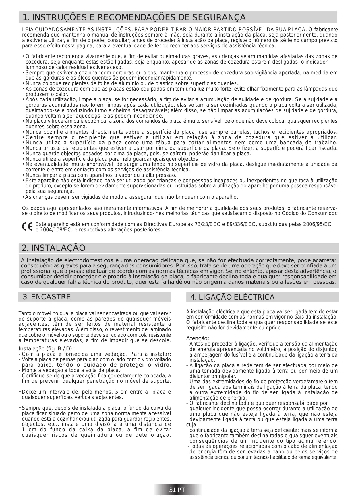 LEIA CUIDADOSAMENTE AS INSTRUÇOES, PARA PODER TIRAR O MAIOR PARTIDO POSSIVEL DA SUA PLACA. O fabricante recomenda que mantenha o manual de instruçôes sempre à mäo, seja durante a instalaçäo da placa, seja posteriormente, quando a estiver a utilizar, a fim de o poder consultar; antes de proceder à instalaçäo da placa, registe o nümero de série no campo previsto para esse efeito nesta pâgina, para a eventualidade de ter de recorrer aos serviços de assisténcia técnica + 0 fabricante recomenda vivamente que, a fim de evitar queimaduras graves, as crianças sejam mantidas afastadas das zonas de cozedura, seja enquanto estas estäo ligadas, seja enquanto, apesar de as zonas de cozedura estarem desligadas, o indicador luminoso de calor residual estiver aceso. + Sempre que estiver a cozinhar com gorduras ou éleos, mantenha o processo de cozedura sob vigiläncia apertada, na medida em que as gorduras e os 6leos quentes Se podem incendiar rapidamente. + Nunca coloque recipientes de folha de aluminio ou de pléstico sobre superficies quentes + As zonas de cozedura com que as placas estäo equipadas emitem uma luz muito forte; evite olhar fixamente para as läâmpadas que roduzem o calor. .Rpés cada utilizaçäo, limpe a placa, se for necessärio, a fim de evitar a acumulaçäo de sujidade e de gordura. Se a sujidade e a gorduras acumuladas näo forem limpas apés cada utilizaçäo, elas voltam a ser cozinhadas quando a placa volta a ser utilizada, queimando-se e produzindo fumo e cheiros desagradäveis; além disso, se no limpar as acumulaçôes de sujidade e de gordura, quando voltam a ser aquecidas, elas podem incendiar-se. : + Na placa vitrocerâmica electrénica, a zona dos comandos da placa 6 muito sensivel, pelo que näo deve colocar quaisquer recipientes quentes sobre essa zona. *Nunca cozinhe alimentos directamente sobre a superficie da placa; use sempre panelas, tachos e recipientes apropriados *Centre sempre o recipiente que estiver a utilizar em relaçäo à zona de cozedura que estiver a utilizar. +Nunca utilize a superficie da placa como uma tébua para cortar alimentos nem como uma bancada de trabalho + Nunca arraste os recipientes que estiver a usar por cima da superficie da placa. Se o fizer, a superficie poderé ficar riscada + Nunca guarde objectos pesados por cima da placa, pois, se cairem, poderäo danificar a placa. + Nunca ütilize a superficie da placa para nela guardar quaisquer objectos. + Na eventualidade, muito improvävel, de surgir uma fenda na superficie de vidro da placa, desligue imediatamente a unidade da corrente e entre em contacto com os serviços de assistência técnica + Nunca limpar a placa com aparelhos a vapor ou a alta pressäo. + Este aparelho näo esté indicado para ser utilizado por crianças e por pessoas incapazes ou inexperientes no que toca à utilizaçäo do produto, excepto se forem devidamente supervisionadas ou instruidas sobre a utilizaçäo do aparelho por uma pessoa responsävel pela sua segurança As crianças devem ser vigiadas de modo a assegurar que näo brinquem com o aparelho. Os dados aqui apresentados säo meramente informativos. A fim de melhorar a qualidade dos seus produtos, o fabricante reserva- se o direito de modificar os seus produtos, introduzindo-lhes melhorias técnicas que satisfaçam o disposto no Cédigo do Consumidor. [é € Este aparelho esté em conformidade com as Directivas Europeias 73/23/EEC e 89/336/EEC, substituidas pelas 2006/95/EC e 2004/108/EC, e respectivas alteraçôes posteriores.
