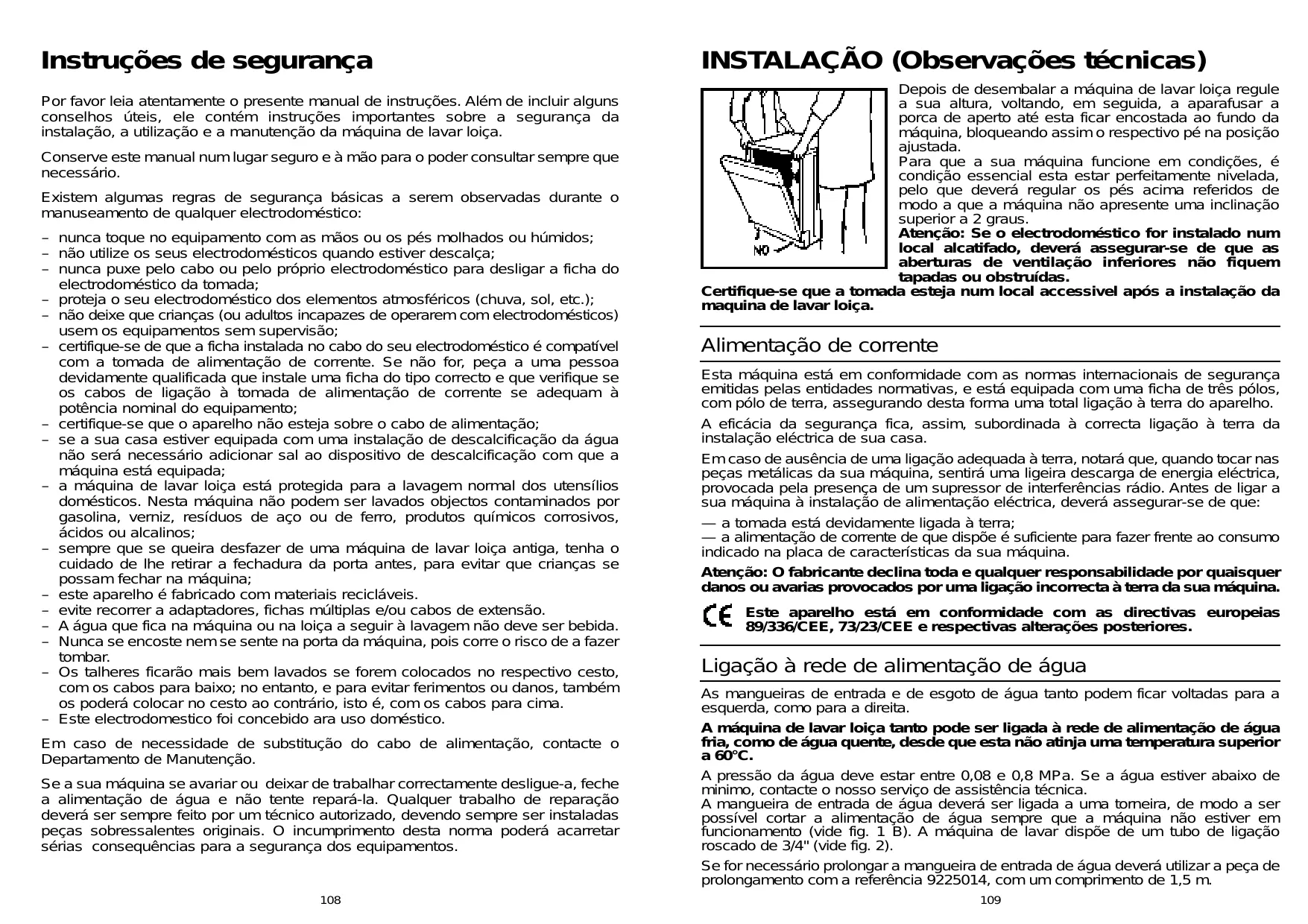 Se for necessário prolongar a mangueira de entrada de água deverá utilizar a peça de prolongamento com a referência 9225014, com um comprimento de 1,5 m. 109 Se a máquina for ligada a uma instalação de alimentação de água nova ou que tenha estado sem ser utilizada durante um certo tempo, será recomendável deixar correr a água durante alguns minutos antes de ligar as mangueiras de admissão de água da máquina. Evita-se assim que eventuais depósitos de areia ou de ferrugem possam entupir o filtro de admissão de água.