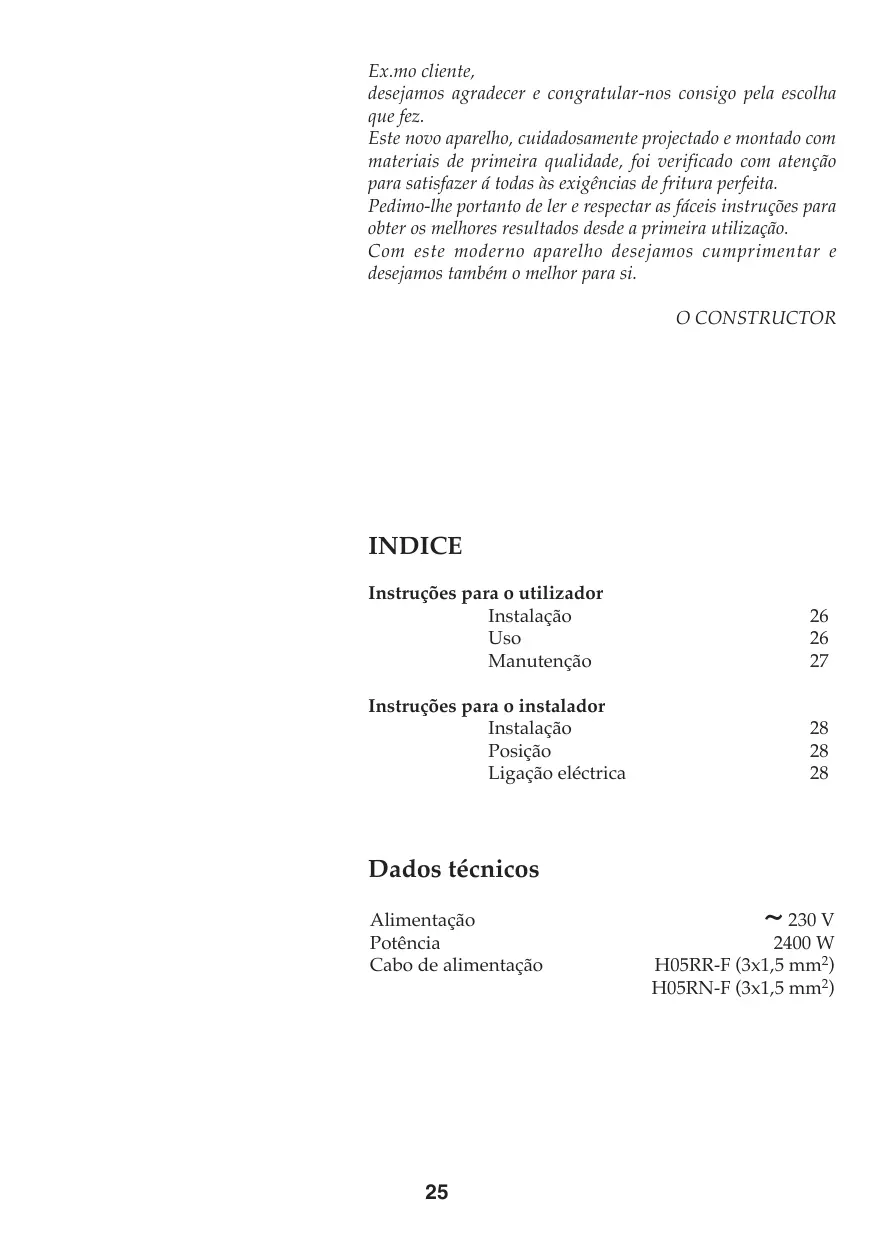 Ex.mo cliente, desejamos agradecer e congratular-nos consigo pela escolha que fez. Este novo aparelho, cuidadosamente projectado e montado com materiais de primeira qualidade, foi verificado com atenção para satisfazer á todas às exigências de fritura perfeita. Pedimo-lhe portanto de ler e respectar as fáceis instruções para obter os melhores resultados desde a primeira utilização. Com este moderno aparelho desejamos cumprimentar e desejamos também o melhor para si. O CONSTRUCTOR INDICE Instruções para o utilizador Instalação Uso Manutenção