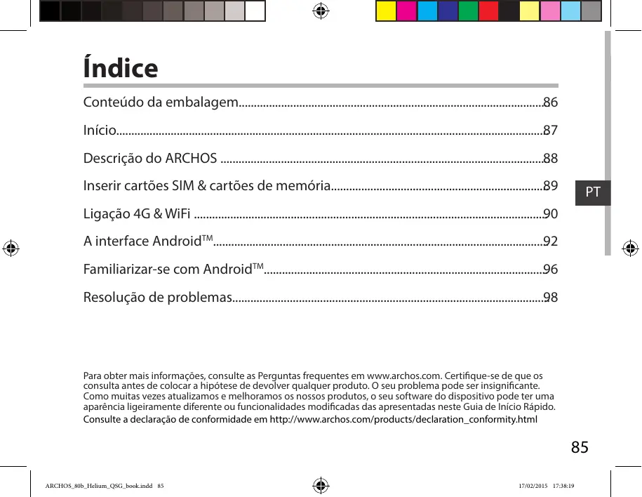 - Resolução de problemas Para obter mais informações, consulte as Perguntas frequentes em www.archos.com. Certifique-se de que os consulta antes de colocar a hipótese de devolver qualquer produto. O seu problema pode ser insignificante. Como muitas vezes atualizamos e melhoramos os nossos produtos, o seu software do dispositivo pode ter uma aparência ligeiramente diferente ou funcionalidades modificadas das apresentadas neste Guia de Início Rápido. Consulte a declaração de conformidade em http://www.archos.com/products/declaration_conformity.html p. 98