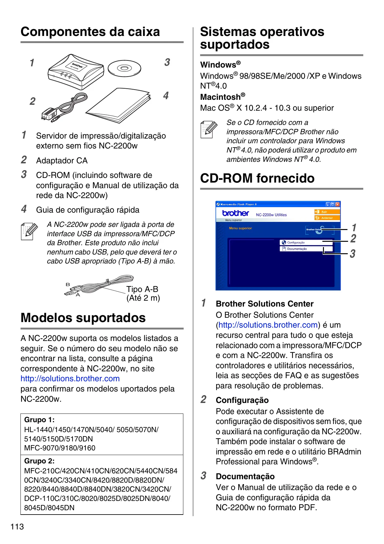 4 Guia de configuraçäo répida 2 A NC-2200w pode ser ligada à porta de interface USB da impressora/MFC/DCP da Brother. Este produto nâo inclui