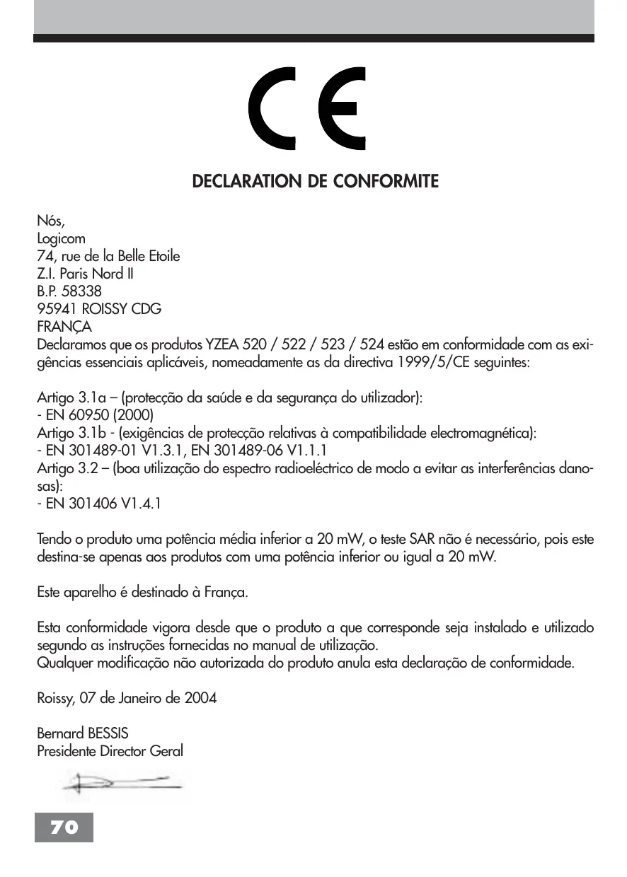 Nós, Logicom 74, rue de la Belle Etoile Z.I. Paris Nord II B.P. 58338 95941 ROISSY CDG FRANÇA Declaramos que os produtos YZEA 520 / 522 / 523 / 524 estão em conformidade com as exigências essenciais aplicáveis, nomeadamente as da directiva 1999/5/CE seguintes: Artigo 3.1a – (protecção da saúde e da segurança do utilizador): - EN 60950 (2000) Artigo 3.1b - (exigências de protecção relativas à compatibilidade electromagnética): - EN 301489-01 V1.3.1, EN 301489-06 V1.1.1 Artigo 3.2 – (boa utilização do espectro radioeléctrico de modo a evitar as interferências danosas): - EN 301406 V1.4.1 Tendo o produto uma potência média inferior a 20 mW, o teste SAR não é necessário, pois este destina-se apenas aos produtos com uma potência inferior ou igual a 20 mW. Este aparelho é destinado à França. Esta conformidade vigora desde que o produto a que corresponde seja instalado e utilizado segundo as instruções fornecidas no manual de utilização. Qualquer modificação não autorizada do produto anula esta declaração de conformidade. Roissy, 07 de Janeiro de 2004 Bernard BESSIS Presidente Director Geral