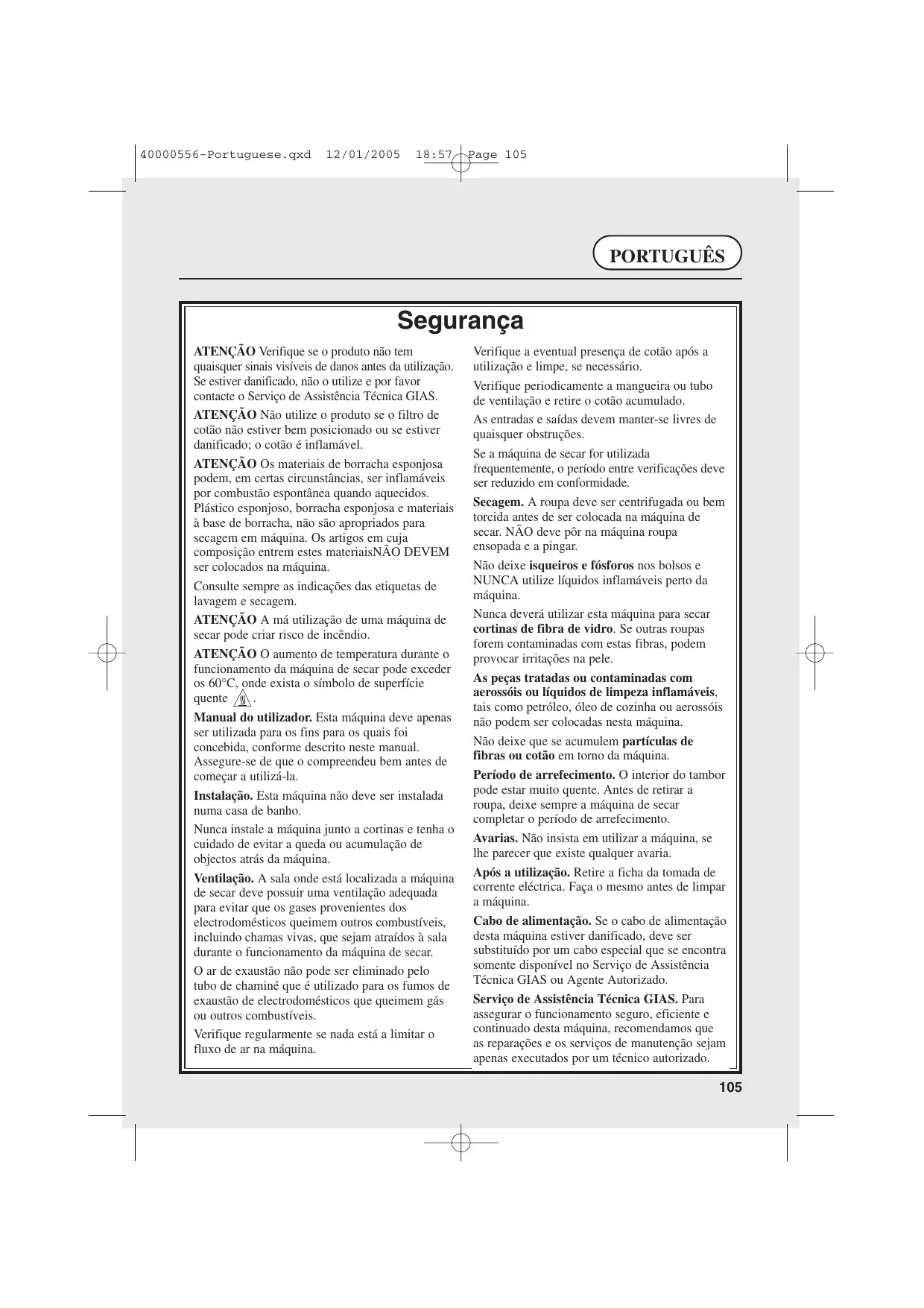 Il est nécessaire d’inspecter régulièrement le tuyau ou la conduite de ventilation et d’éliminer les accumulations éventuelles de peluches. Les entrées et sorties doivent être libres d’obstructions. Si le sèche-linge est utilisé fréquemment, les intervalles entre les inspections doivent être réduits en conséquence. Degré de séchage. Les vêtements doivent être essorés en machine ou à la main avant d’être placés dans le sèche-linge. Les vêtements qui dégoulinent NE DOIVENT PAS être mis dans le sèche-linge. Enlevez les briquets et les allumettes des poches et veillez à ne JAMAIS utiliser de liquides inflammables à proximité de la machine. Les rideaux en fibres de verre ne doivent jamais être placés dans cette machine. La contamination d’autres vêtements par les fibres de verre peut entraîner des irritations de la peau. Les vêtements traités ou contaminés par des produits de nettoyage ou des liquides inflammables, comme le pétrole, l’huile de cuisson ou les aérosols ne doivent pas être placés dans la machine. Veillez à ce que les peluches ne puissent pas s’accumuler sur le sol, à l’extérieur de la machine. Période de refroidissement. Il se peut que l’intérieur du tambour soit très chaud. Veillez à ce que le sèche-linge termine son cycle de refroidissement avant d’en sortir le linge. Pannes. Cessez d’utiliser la machine si elle semble défectueuse. Après usage. Débranchez du courant de secteur. Retirez toujours la prise avant de nettoyer la machine. Cordon d’alimentation. Si le cordon d’alimentation de cet appareil est endommagé, il doit être remplacé par un cordon spécial exclusivement disponible auprès de GIAS Service ou d’un distributeur agréé. Service GIAS. Pour veiller au fonctionnement sûr et efficace de cet appareil, il est conseillé de faire appel à un technicien agréé pour les entretiens et les réparations.