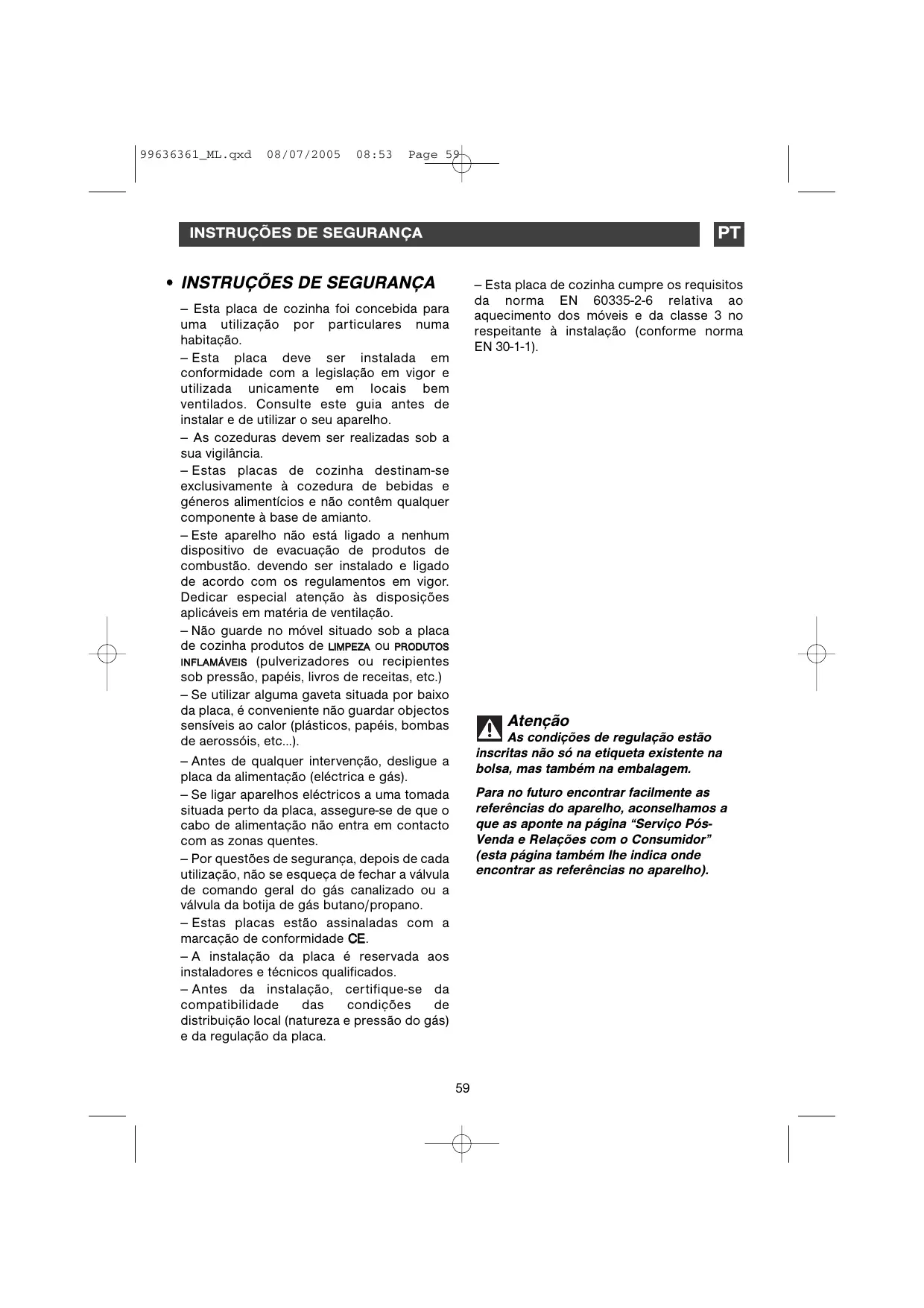 -Esta placadecozinha cumpresos requisitos da norma EN 60335-2-6 relativa ao aquecimento dos moveis e da classe 3 no respectante a instalacao (conforme normal EN 30-1-1).
