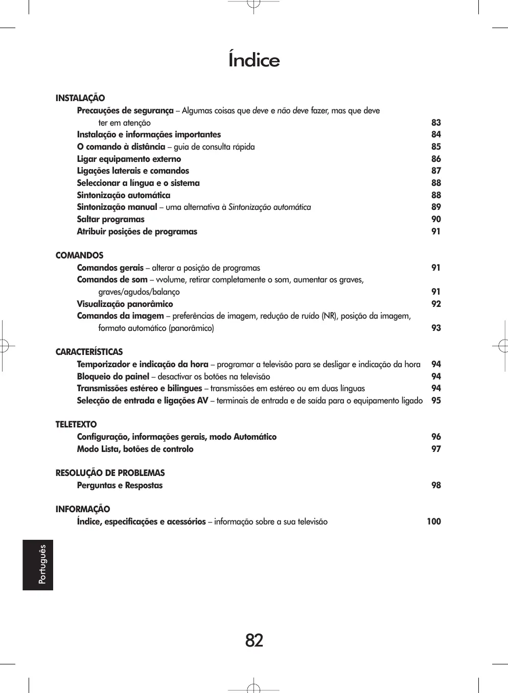 Agudos91 Apresentação da hora 94 Atribuição de programas 91 Aumentar os graves91 Balanço91 Bloqueio do painel94 Brilho 93 Comando à distância85 Comandos87 Contraste93 Convergência98 Cor 93 Definição93 Ecrã azul99 Emissão bilingue94 Estéreo 94 Formato automático (panorâmica)93 Graves 91 Instalação 84 Introdução directa de canais90 Ligações – parte lateral87 Ligações – atrás86 Ligações AV95 Ligar a televisão87 Língua 88