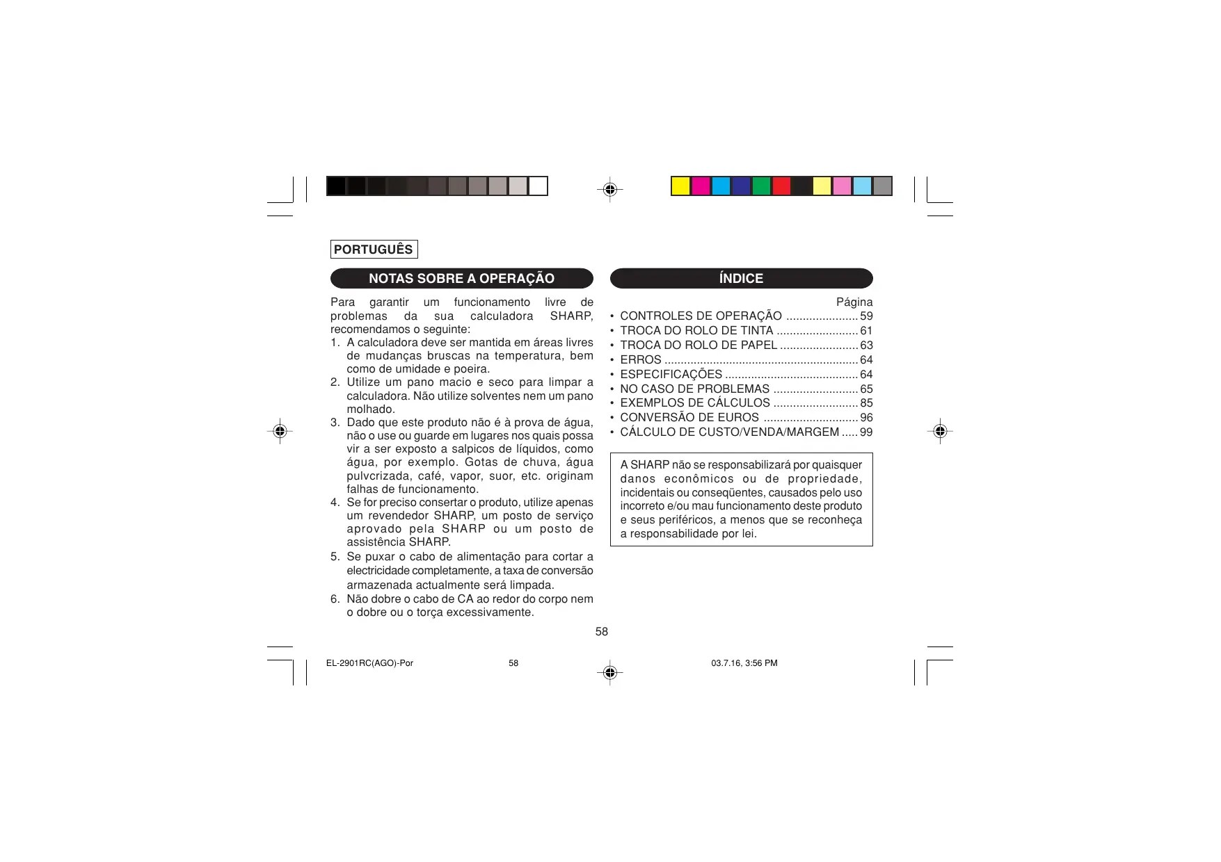 EL-2901RC(AGO)-Spa “741.9 + ”. La velocidad de impresión variará con el número de filas y los tipos de figuras que desean imprimir.) Papel de impresión: 57 mm – 58 mm de ancho, 80 mm de diámetro (máx.) Temperatura: 0°C – 40°C Potencia: 41 mA Dimensiones: 193 mm (An) × 256 mm (P) 2. Cuando la parte entera de los contenidos de la Se la parte intera del contenuto della memoria consiste in più di 12 cifre. (Es. 999999999999 1 A SHARP não se responsabilizará por quaisquer danos econômicos ou de propriedade, incidentais ou conseqüentes, causados pelo uso incorreto e/ou mau funcionamento deste produto e seus periféricos, a menos que se reconheça a responsabilidade por lei.