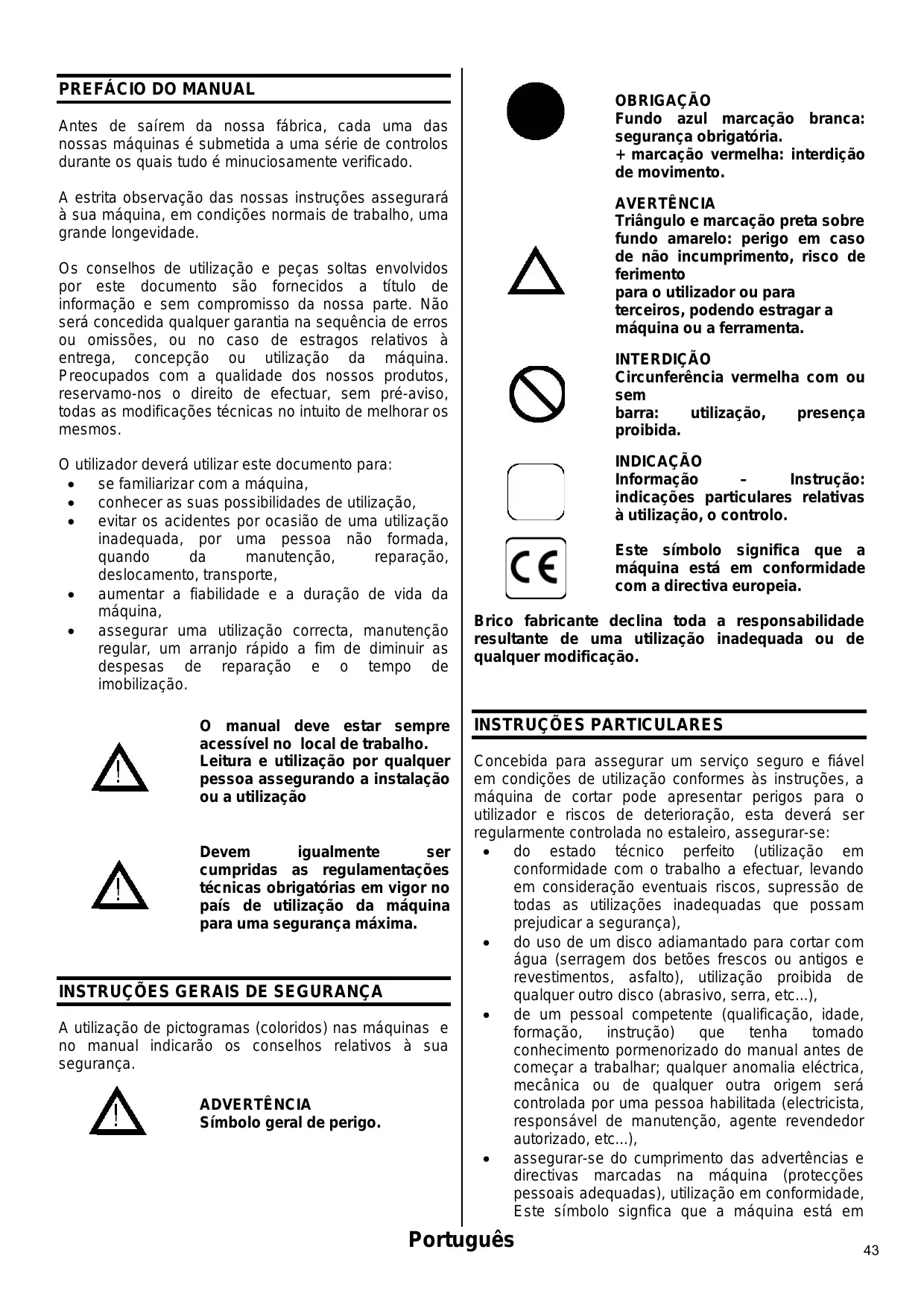 A utilização de pictogramas (coloridos) nas máquinas e no manual indicarão os conselhos relativos à sua segurança. ADVERTÊNCIA Símbolo geral de perigo. INTERDIÇÃO Circunferência vermelha com ou sem barra: utilização, presença proibida. INDICAÇÃO Informação Instrução: indicações particulares relativas à utilização, o controlo. Este símbolo significa que a máquina está em conformidade com a directiva europeia. Brico fabricante declina toda a responsabilidade resultante de uma utilização inadequada ou de qualquer modificação.