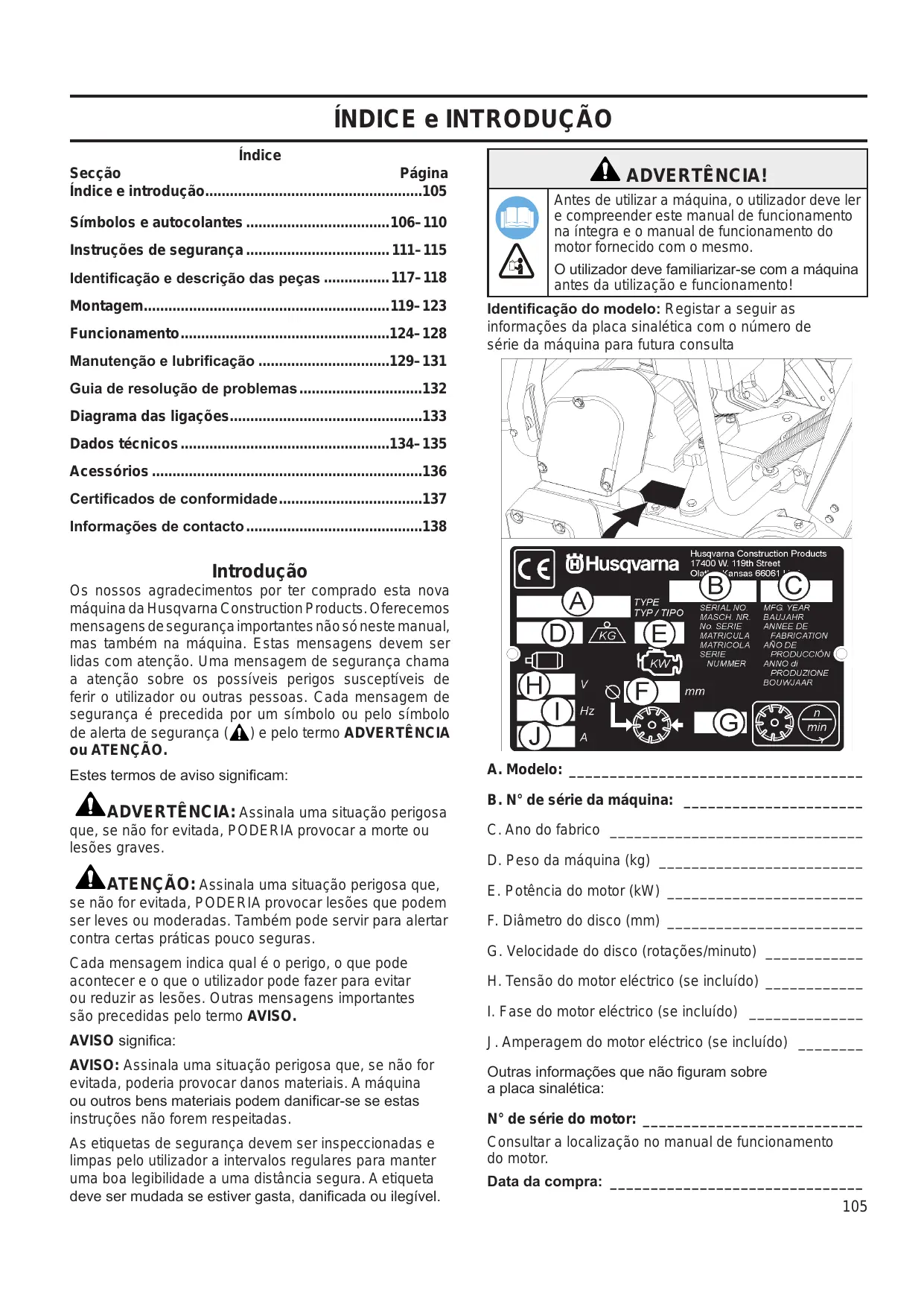 - Informações de contacto Introdução Os nossos agradecimentos por ter comprado esta nova máquina da Husqvarna Construction Products. Oferecemos mensagens de segurança importantes não só neste manual, mas também na máquina. Estas mensagens devem ser lidas com atenção. Uma mensagem de segurança chama a atenção sobre os possíveis perigos susceptíveis de ferir o utilizador ou outras pessoas. Cada mensagem de segurança é precedida por um símbolo ou pelo símbolo de alerta de segurança ( ) e pelo termo ADVERTÊNCIA ou ATENÇÃO. Estes termos de aviso significam: ADVERTÊNCIA: Assinala uma situação perigosa A. Modelo: _____________________________________ B. N° de série da máquina: _ ______________________ que, se não for evitada, PODERIA provocar a morte ou lesões graves. C. Ano do fabrico _ _______________________________ ATENÇÃO: Assinala uma situação perigosa que, se não for evitada, PODERIA provocar lesões que podem ser leves ou moderadas. Também pode servir para alertar contra certas práticas pouco seguras. E. Potência do motor (kW) _________________________ Cada mensagem indica qual é o perigo, o que pode acontecer e o que o utilizador pode fazer para evitar ou reduzir as lesões. Outras mensagens importantes são precedidas pelo termo AVISO. D. Peso da máquina (kg) __________________________ F. Diâmetro do disco (mm) _________________________ G. Velocidade do disco (rotações/minuto) _____________ H. Tensão do motor eléctrico (se incluído) _____________ p. 138
