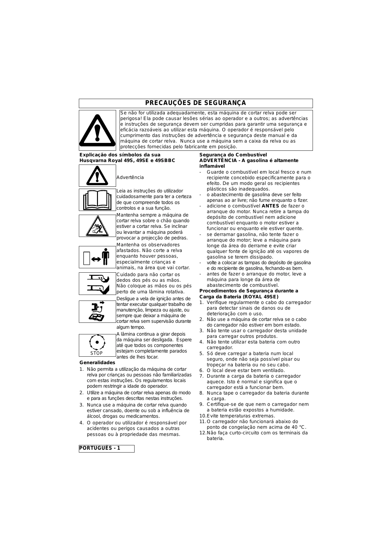 Segurança do Combustível ADVERTÊNCIA - A gasolina é altamente inflamável - Guarde o combustível em local fresco e num recipiente concebido especificamente para o efeito. De um modo geral os recipientes plásticos são inadequados. - o abastecimento de gasolina deve ser feito apenas ao ar livre; não fume enquanto o fizer. - adicione o combustível ANTES de fazer o arranque do motor. Nunca retire a tampa do depósito de combustível nem adicione combustível enquanto o motor estiver a funcionar ou enquanto ele estiver quente. - se derramar gasolina, não tente fazer o arranque do motor; leve a máquina para longe da área do derrame e evite criar qualquer fonte de ignição até os vapores de gasolina se terem dissipado. - volte a colocar as tampas do depósito de gasolina e do recipiente de gasolina, fechando-as bem. - antes de fazer o arranque do motor, leve a máquina para longe da área de abastecimento de combustível. Procedimentos de Segurança durante a Carga da Bateria (ROYAL 49SE)