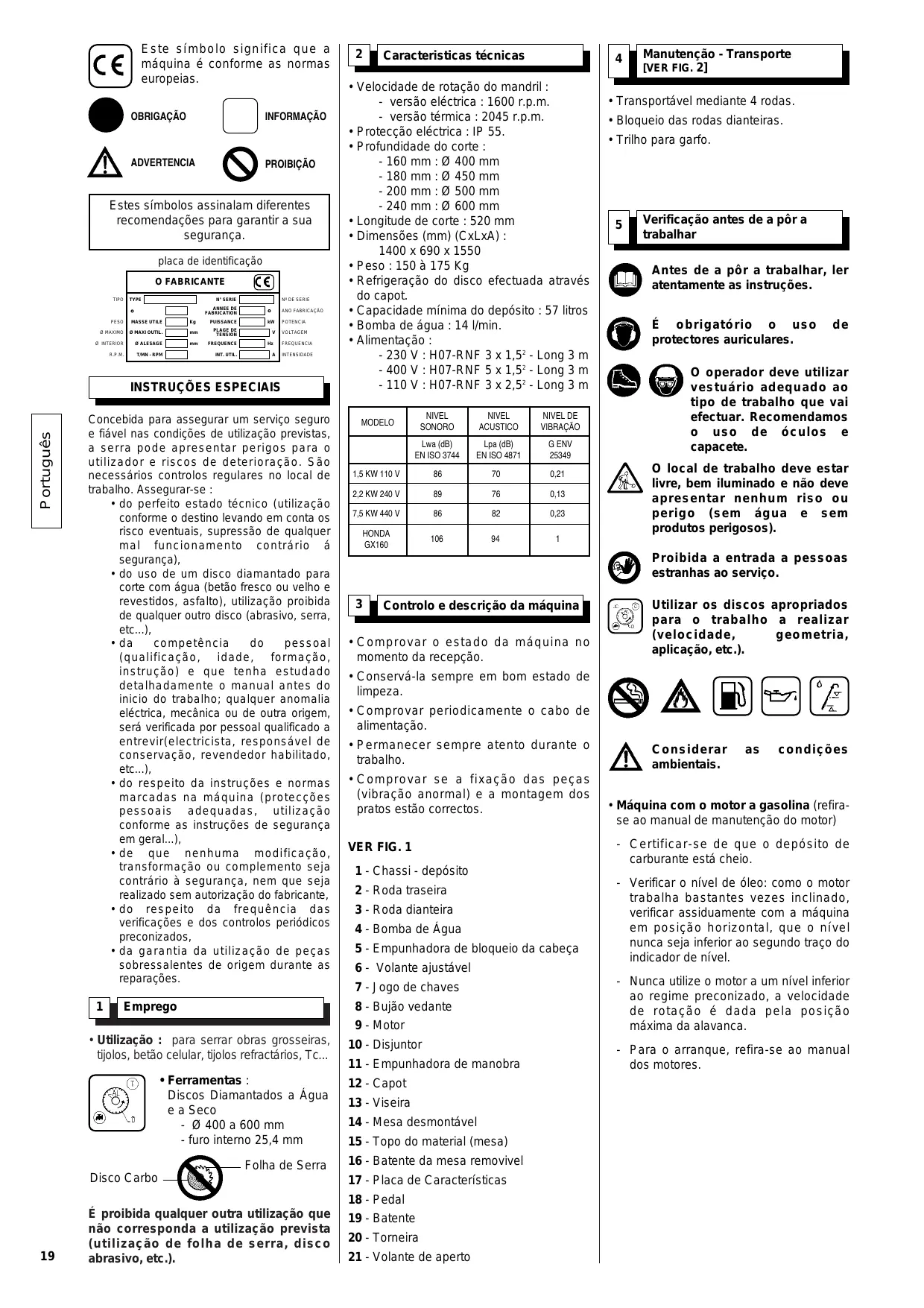 - Utilização : para serrar obras grosseiras, tijolos, betão celular, tijolos refractários, Tc... Manutenção - Transporte [VER FIG. 2] Proibida a entrada a pessoas estranhas ao serviço.