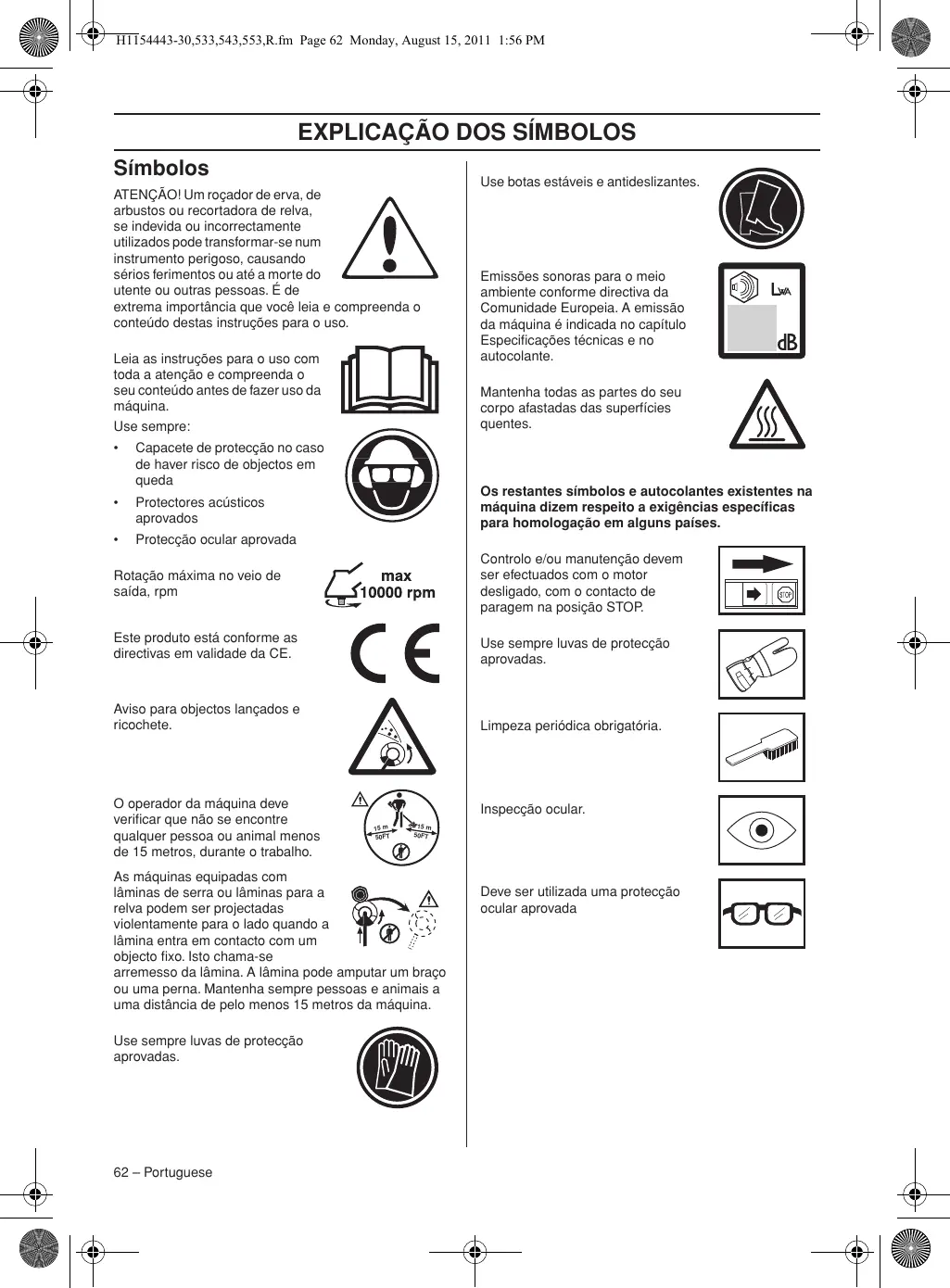 Durante el trabajo, el usuario de la máquina debe procurar que ninguna persona o animal se acerque a más de 15 metros a la máquina.