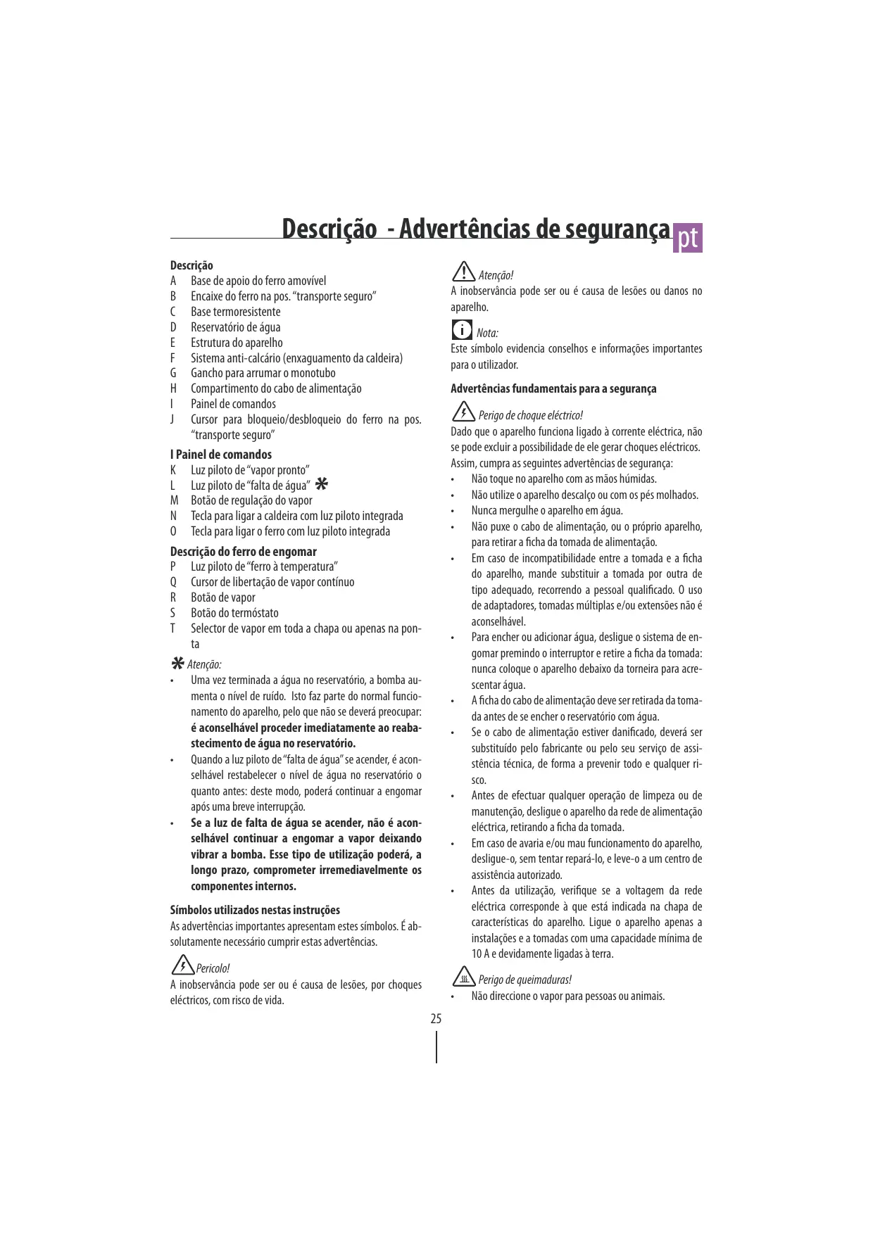 Base de apoio do ferro amovível Encaixe do ferro na pos. “transporte seguro” Base termoresistente Reservatório de água Estrutura do aparelho Sistema anti-calcário (enxaguamento da caldeira) Gancho para arrumar o monotubo Compartimento do cabo de alimentação Painel de comandos Cursor para bloqueio/desbloqueio do ferro na pos. “transporte seguro” I Painel de comandos K Luz piloto de “vapor pronto” L Luz piloto de “falta de água” M Botão de regulação do vapor N Tecla para ligar a caldeira com luz piloto integrada O Tecla para ligar o ferro com luz piloto integrada Descrição do ferro de engomar P Luz piloto de “ferro à temperatura” Q Cursor de libertação de vapor contínuo R Botão de vapor S Botão do termóstato T Selector de vapor em toda a chapa ou apenas na ponta Nota: Este símbolo evidencia conselhos e informações importantes para o utilizador. Advertências fundamentais para a segurança Perigo de choque eléctrico! Dado que o aparelho funciona ligado à corrente eléctrica, não se pode excluir a possibilidade de ele gerar choques eléctricos. Assim, cumpra as seguintes advertências de segurança: t /ÍPUPRVFOPBQBSFMIPDPNBTNÍPTIÞNJEBT t /ÍPVUJMJ[FPBQBSFMIPEFTDBMÎPPVDPNPTQÏTNPMIBEPT t /VODBNFSHVMIFPBQBSFMIPFNÈHVB t /ÍPQVYFPDBCPEFBMJNFOUBÎÍP PVPQSØQSJPBQBSFMIP para retirar a ficha da tomada de alimentação. t &NDBTPEFJODPNQBUJCJMJEBEFFOUSFBUPNBEBFBöDIB do aparelho, mande substituir a tomada por outra de tipo adequado, recorrendo a pessoal qualificado. O uso de adaptadores, tomadas múltiplas e/ou extensões não é aconselhável. t 1BSBFODIFSPVBEJDJPOBSÈHVB EFTMJHVFPTJTUFNBEFFOgomar premindo o interruptor e retire a ficha da tomada: nunca coloque o aparelho debaixo da torneira para acrescentar água. t "öDIBEPDBCPEFBMJNFOUBÎÍPEFWFTFSSFUJSBEBEBUPNBda antes de se encher o reservatório com água. t 4FPDBCPEFBMJNFOUBÎÍPFTUJWFSEBOJöDBEP EFWFSÈTFS substituído pelo fabricante ou pelo seu serviço de assistência técnica, de forma a prevenir todo e qualquer risco. t "OUFT EF FGFDUVBS RVBMRVFS PQFSBÎÍP EF MJNQF[B PV EF manutenção, desligue o aparelho da rede de alimentação eléctrica, retirando a ficha da tomada. t &NDBTPEFBWBSJBFPVNBVGVODJPOBNFOUPEPBQBSFMIP desligue-o, sem tentar repará-lo, e leve-o a um centro de assistência autorizado. t "OUFT EB VUJMJ[BÎÍP WFSJöRVF TF B WPMUBHFN EB SFEF eléctrica corresponde à que está indicada na chapa de características do aparelho. Ligue o aparelho apenas a instalações e a tomadas com uma capacidade mínima de 10 A e devidamente ligadas à terra.