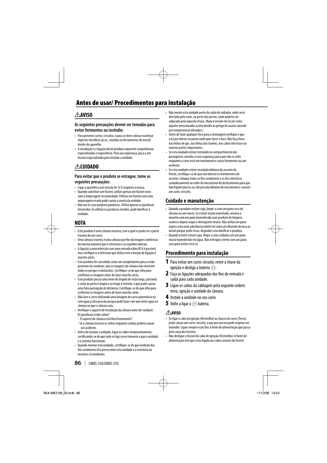 NOTA • Este produto é uma câmara traseira, com a qual se pode ver a parte traseira de um carro. • Uma câmara traseira é uma câmara que lhe dá imagens simétricas da mesma maneira que o retrovisor e os espelhos laterais. • A ligação a uma televisão com uma entrada vídeo RCA é possível, mas verifique se a televisão que utiliza tem a função de ligação à marcha-atrás. • Este produto foi concebido como um complemento para a visão posterior do condutor, mas as imagens da câmara não mostram todos os perigos e obstáculos. Certifique-se de que olha para confirmar as imagens antes de fazer marcha-atrás. • Este produto possui uma lente de ângulo de visão larga, portanto a visão ao perto é ampla e ao longe é estreita, o que pode causar uma falsa percepção de distância. Certifique-se de que olha para confirmar as imagens antes de fazer marcha-atrás. • Não lave o carro utilizando uma lavagem de carro automática ou com água a alta pressão porque pode fazer com que entre água na câmara ou que a câmara caia. • Verifique o suporte de instalação da câmara antes de conduzir. Os parafusos estão soltos? - O suporte da câmara está fixo firmemente? - Se a câmara traseira se soltar enquanto conduz poderá causar um acidente. • Antes de instalar a unidade, ligue os cabos temporariamente, certificando-se de que tudo se liga correctamente e que a unidade e o sistema funcionam. • Quando montar esta unidade, certifique-se de que nenhum dos fios condutores fica preso entre esta unidade e a estrutura ou encaixes circundantes.