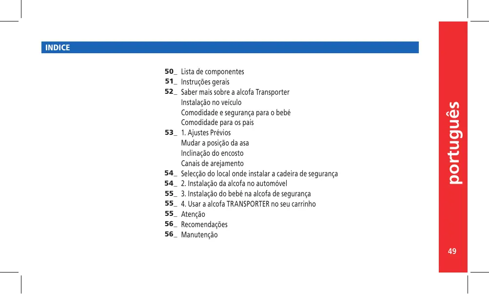 Atenção Recomendações Manutenção português 50_ Lista de componentes 51_ Instruções gerais 52_ Saber mais sobre a alcofa Transporter