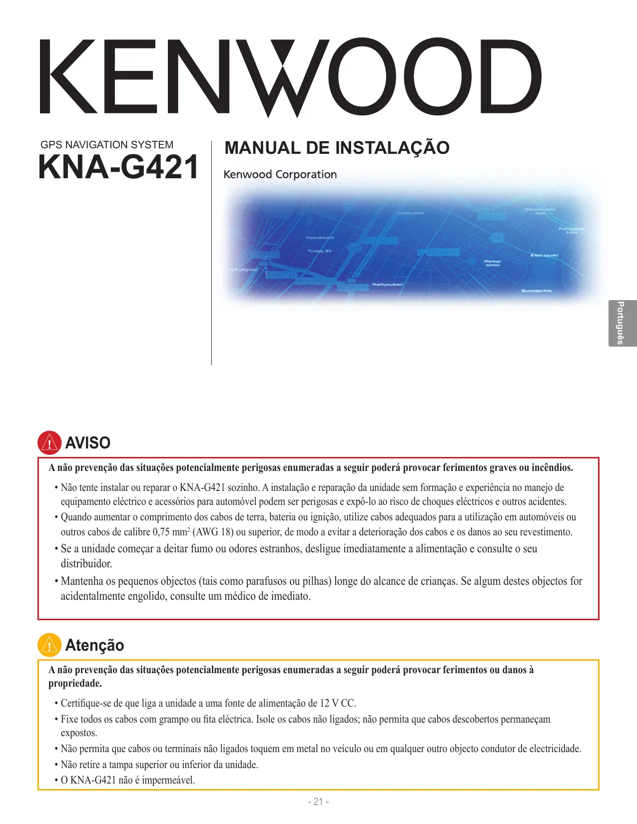 AVISO A não prevenção das situações potencialmente perigosas enumeradas a seguir poderá provocar ferimentos graves ou incêndios. • Não tente instalar ou reparar o KNA-G421 sozinho. A instalação e reparação da unidade sem formação e experiência no manejo de equipamento eléctrico e acessórios para automóvel podem ser perigosas e expô-lo ao risco de choques eléctricos e outros acidentes. • Quando aumentar o comprimento dos cabos de terra, bateria ou ignição, utilize cabos adequados para a utilização em automóveis ou outros cabos de calibre 0,75 mm2 (AWG 18) ou superior, de modo a evitar a deterioração dos cabos e os danos ao seu revestimento.