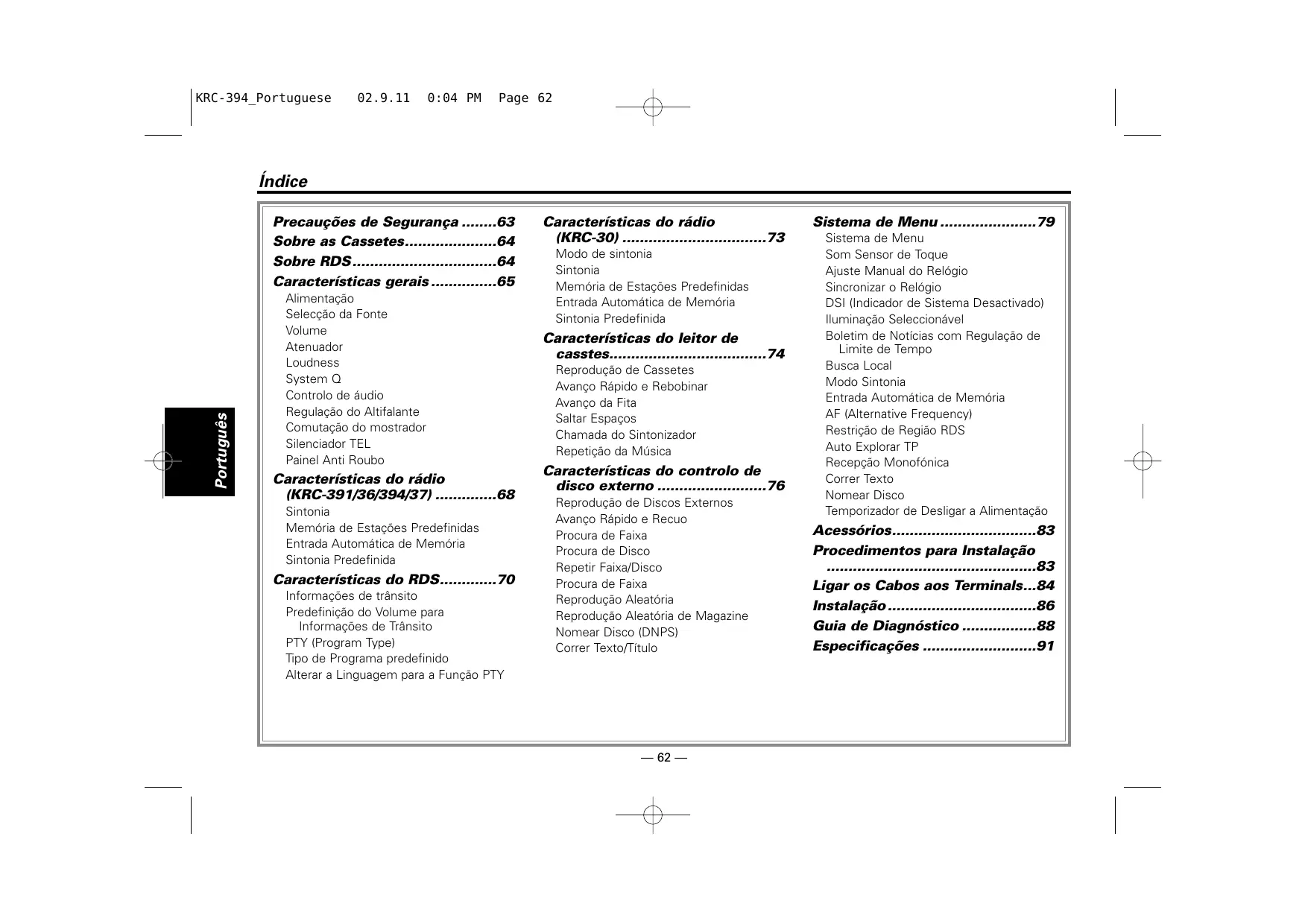 Precauções de Segurança 63 Sobre as Cassetes64 Sobre RDS64 Características gerais 65 Alimentação Selecção da Fonte Volume Atenuador Loudness System Q Controlo de áudio Regulação do Altifalante Comutação do mostrador Silenciador TEL Painel Anti Roubo