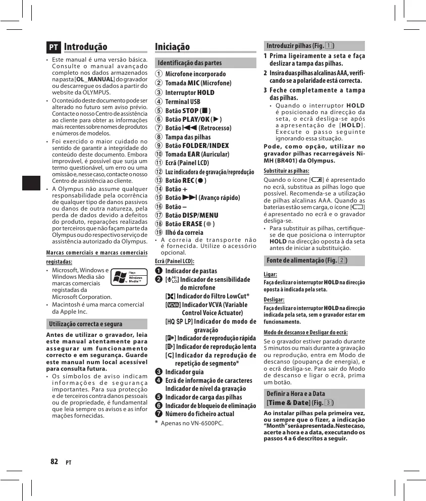 - Apenas no VN-6500PC. Introduzir pilhas (Fig. 1) 1 Prima ligeiramente a seta e faça deslizar a tampa das pilhas. 2 Insira duas pilhas alcalinas AAA, verificando se a polaridade está correcta. 3 Feche completamente a tampa das pilhas.