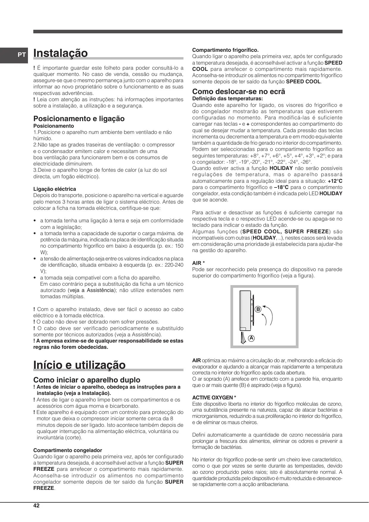 Definição das temperaturas: Quando este aparelho for ligado, os visores do frigorífico e do congelador mostrarão as temperaturas que estiverem configuradas no momento. Para modificá-las é suficiente carregar nas teclas - e + correspondentes ao compartimento do qual se desejar mudar a temperatura. Cada pressão das teclas incrementa ou decrementa a temperatura e em modo equivalente também a quantidade de frio gerado no interior do compartimento. Podem ser seleccionadas para o compartimento frigorífico as seguintes temperaturas: +8°, +7°, +6°, +5°, +4°, +3°, +2°; e para o congelador: -18°, -19°,-20°, -21°, -22°, -24°, -26°. Quando estiver activa a função HOLIDAY não serão possíveis regulações de temperatura, mas o aparelho passará automaticamente para a regulação ideal para a situação: +12°C para o compartimento frigorífico e –18°C para o compartimento congelador, esta condição também é indicada pelo LED HOLIDAY que se acende. Para activar e desactivar as funções é suficiente carregar na respectiva tecla e o respectivo LED acende-se ou apaga-se no teclado para indicar o estado da função. Algumas funções (SPEED COOL, SUPER FREEZE) são incompatíveis com outras (HOLIDAY, ..), nestes casos será levada em consideração uma prioridade já estabelecida para ajudar-lhe na gestão do aparelho. AIR * Pode ser reconhecido pela presença do dispositivo na parede superior do compartimento frigorífico (veja a figura).