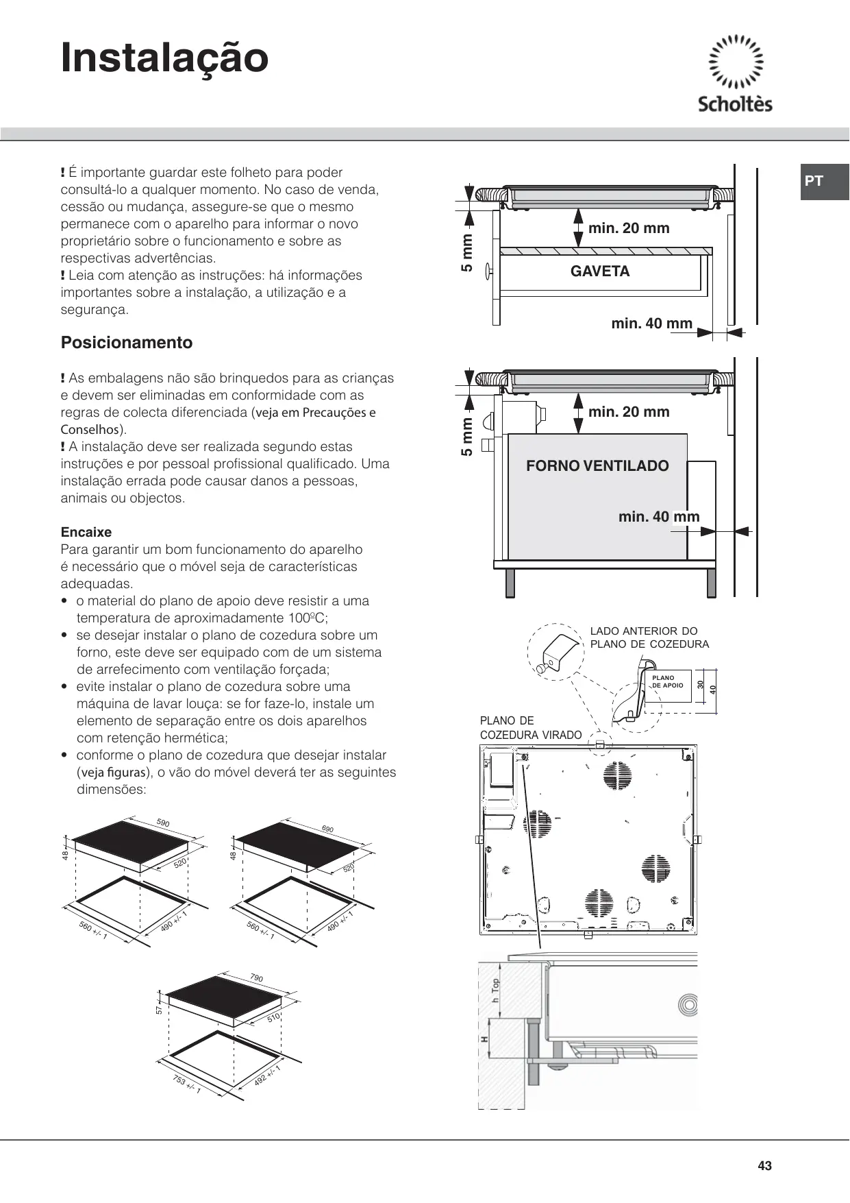 5 mm ! É importante guardar este folheto para poder consultá-lo a qualquer momento. No caso de venda, cessão ou mudança, assegure-se que o mesmo permanece com o aparelho para informar o novo proprietário sobre o funcionamento e sobre as respectivas advertências. ! Leia com atenção as instruções: há informações importantes sobre a instalação, a utilização e a segurança. min. 20 mm GAVETA min. 40 mm Posicionamento min. 20 mm 5 mm ! As embalagens não são brinquedos para as crianças e devem ser eliminadas em conformidade com as regras de colecta diferenciada (veja em Precauções e Conselhos). ! A instalação deve ser realizada segundo estas instruções e por pessoal profissional qualificado. Uma instalação errada pode causar danos a pessoas, animais ou objectos. FORNO VENTILADO min. 40 mm
