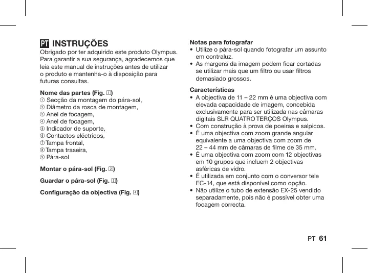 Encontre gratuitamente o manual do aparelho ZUIKO DIGITAL 11-22 MM 1:2.8-3.5 OLYMPUS em formato PDF.