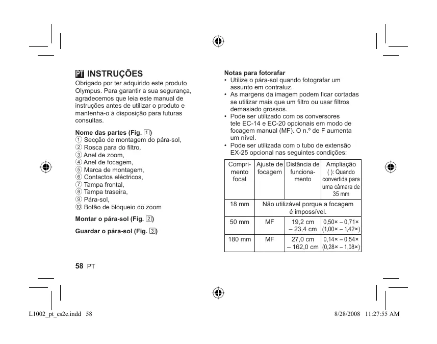 Encontre gratuitamente o manual do aparelho ZUIKO DIGITAL ED 18-180MM F3.5-6.3 OLYMPUS em formato PDF.