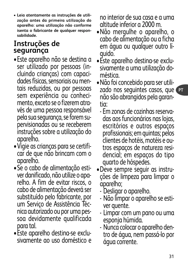 à 2000 m. • Ne pas mettre l’appareil, le câble d’alimentation ou la fiche dans l’eau ou tout autre liquide. • Votre machine a été conçue pour un usage domestique seulement. • Elle n’a pas été conçue pour être utilisée dans les cas suivants qui ne sont pas couverts par la garantie: - Dans des coins de cuisines réservés au personnel dans des magasins, bureaux et autres environnements professionnels ; Dans des fermes ; Par les clients des hôtels, motels et autres environnements à caractère résidentiel ; Dans des environnements de type chambres d’hôtes. • Toujours suivre les instructions de nettoyage pour nettoyer votre appareil; - Débrancher l’appareil. - Ne pas nettoyer l’appareil chaud. - Nettoyer avec un chiffon ou une éponge humide. 7