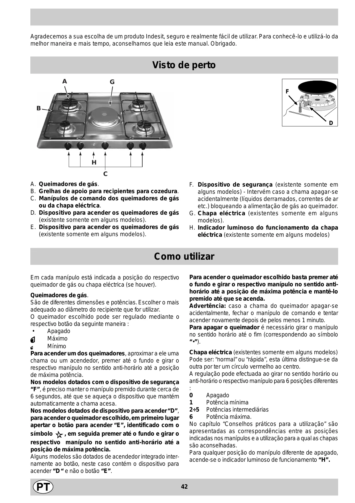 G. Placa eléctricas (presente sólo en algunos modelos) H. Luz indicadora de funcionamiento de las placa eléctricas (presente sólo en algunos modelos)