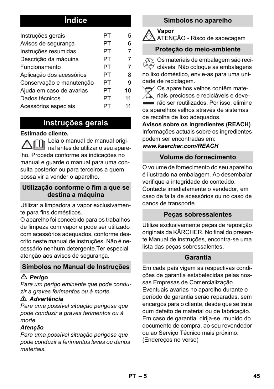 Instruções gerais Estimado cliente, Leia o manual de manual original antes de utilizar o seu aparelho. Proceda conforme as indicações no manual e guarde o manual para uma consulta posterior ou para terceiros a quem possa vir a vender o aparelho. Utilização conforme o fim a que se destina a máquina Utilizar a limpadora a vapor exclusivamente para fins domésticos. O aparelho foi concebido para os trabalhos de limpeza com vapor e pode ser utilizado com acessórios adequados, conforme descrito neste manual de instruções. Não é necessário nenhum detergente.Ter especial atenção aos avisos de segurança. Símbolos no Manual de Instruções Perigo Para um perigo eminente que pode conduzir a graves ferimentos ou à morte. 몇 Advertência Para uma possível situação perigosa que pode conduzir a graves ferimentos ou à morte. Atenção Para uma possível situação perigosa que pode conduzir a ferimentos leves ou danos materiais. Vapor ATENÇÂO - Risco de sapecagem Proteção do meio-ambiente Os materiais de embalagem são recicláveis. Não coloque as embalagens no lixo doméstico, envie-as para uma unidade de reciclagem. Os aparelhos velhos contêm materiais preciosos e recicláveis e deverão ser reutilizados. Por isso, elimine os aparelhos velhos através de sistemas de recolha de lixo adequados. Avisos sobre os ingredientes (REACH) Informações actuais sobre os ingredientes podem ser encontradas em: www.kaercher.com/REACH Volume do fornecimento O volume de fornecimento do seu aparelho é ilustrado na embalagem. Ao desembalar verifique a integridade do conteúdo. Contacte imediatamente o vendedor, em caso de falta de acessórios ou no caso de danos de transporte. Peças sobressalentes Utilize exclusivamente peças de reposição originais da KÄRCHER. No final do presente Manual de instruções, encontra-se uma lista das peças sobressalentes. Garantia Em cada país vigem as respectivas condições de garantia estabelecidas pelas nossas Empresas de Comercialização. Eventuais avarias no aparelho durante o período de garantia serão reparadas, sem encargos para o cliente, desde que se trate dum defeito de material ou de fabricação. Em caso de garantia, dirija-se, munido do documento de compra, ao seu revendedor ou ao Serviço Técnico mais próximo. (Endereços no verso) PT – 5