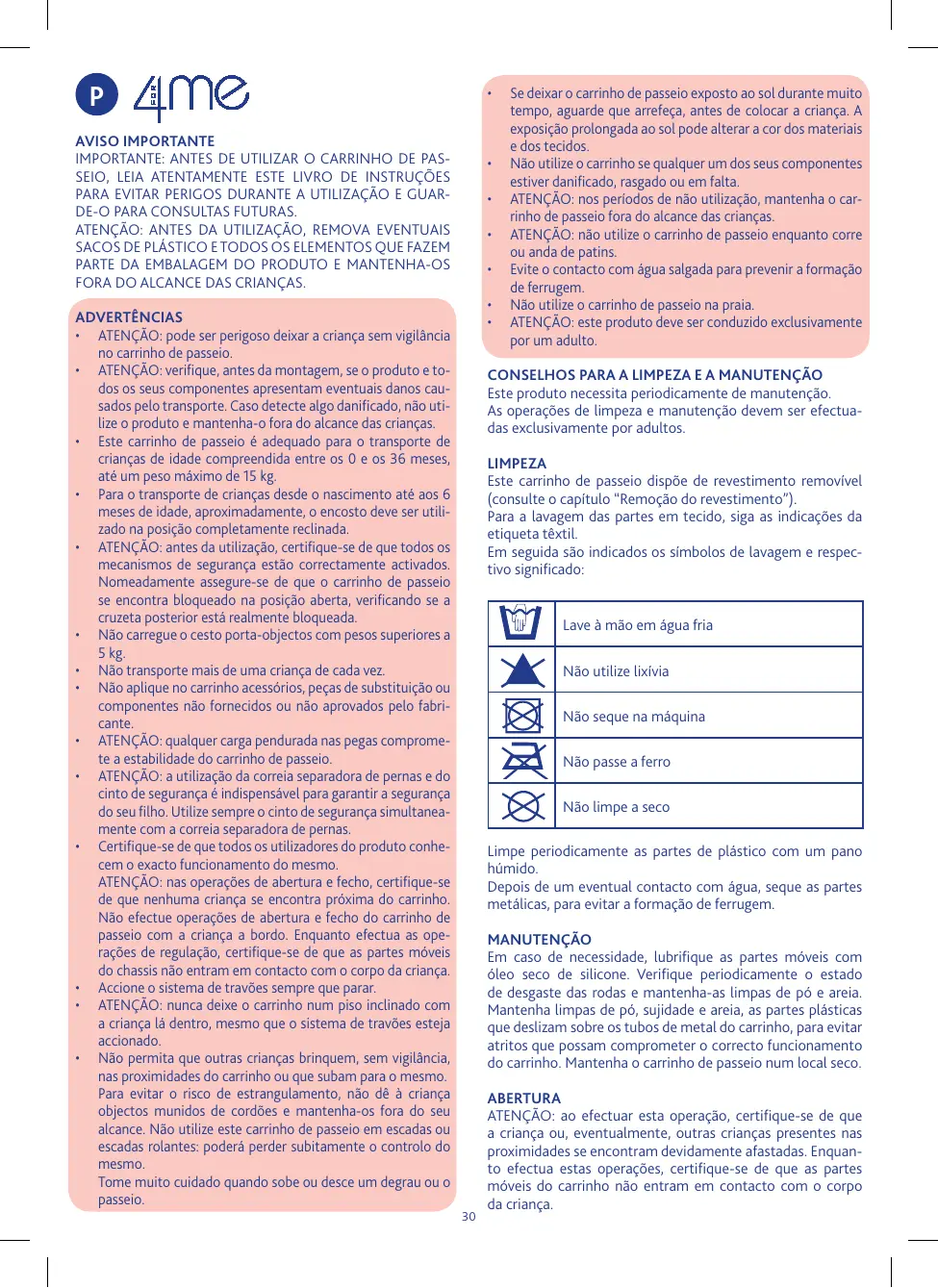 - Não permita que outras crianças brinquem, sem vigilância, nas proximidades do carrinho ou que subam para o mesmo. Para evitar o risco de estrangulamento, não dê à criança objectos munidos de cordões e mantenha-os fora do seu alcance. Não utilize este carrinho de passeio em escadas ou escadas rolantes: poderá perder subitamente o controlo do mesmo. Tome muito cuidado quando sobe ou desce um degrau ou o passeio. Se deixar o carrinho de passeio exposto ao sol durante muito tempo, aguarde que arrefeça, antes de colocar a criança. A exposição prolongada ao sol pode alterar a cor dos materiais e dos tecidos. Não utilize o carrinho se qualquer um dos seus componentes estiver danificado, rasgado ou em falta. ATENÇÃO: nos períodos de não utilização, mantenha o carrinho de passeio fora do alcance das crianças. ATENÇÃO: não utilize o carrinho de passeio enquanto corre ou anda de patins. Evite o contacto com água salgada para prevenir a formação de ferrugem. Não utilize o carrinho de passeio na praia. ATENÇÃO: este produto deve ser conduzido exclusivamente por um adulto. CONSELHOS PARA A LIMPEZA E A MANUTENÇÃO Este produto necessita periodicamente de manutenção. As operações de limpeza e manutenção devem ser efectuadas exclusivamente por adultos. LIMPEZA Este carrinho de passeio dispõe de revestimento removível (consulte o capítulo “Remoção do revestimento”). Para a lavagem das partes em tecido, siga as indicações da etiqueta têxtil. Em seguida são indicados os símbolos de lavagem e respectivo significado: Lave à mão em água fria Não utilize lixívia Não seque na máquina Não passe a ferro Não limpe a seco Limpe periodicamente as partes de plástico com um pano húmido. Depois de um eventual contacto com água, seque as partes metálicas, para evitar a formação de ferrugem. MANUTENÇÃO Em caso de necessidade, lubrifique as partes móveis com óleo seco de silicone. Verifique periodicamente o estado de desgaste das rodas e mantenha-as limpas de pó e areia. Mantenha limpas de pó, sujidade e areia, as partes plásticas que deslizam sobre os tubos de metal do carrinho, para evitar atritos que possam comprometer o correcto funcionamento do carrinho. Mantenha o carrinho de passeio num local seco.