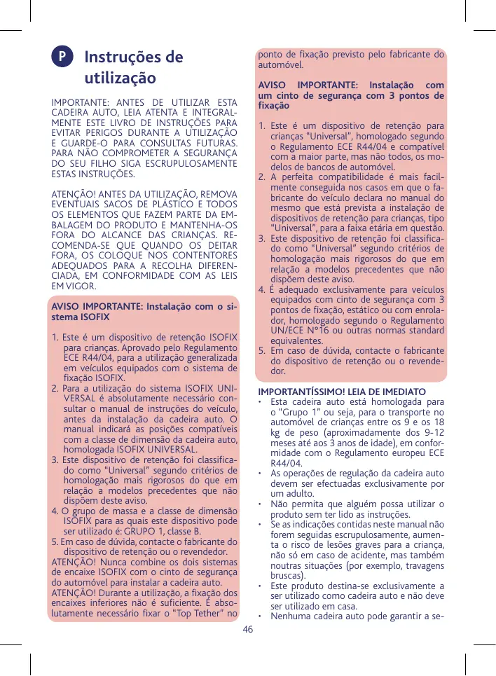 gurança total da criança em caso de acidente, mas a utilização deste produto reduz o risco de ferimentos e morte da criança. Utilize sempre a cadeira auto instalada correctamente e com os cintos de segurança apertados, mesmo em percursos breves. Se não o fizer, pode prejudicar a integridade do seu filho. Verifique, principalmente, se o cinto está devidamente esticado, se não está torcido ou posicionado de modo incorrecto. Após um acidente, ainda que ligeiro, a cadeira auto pode ter sofrido danos não visíveis a olho nu, por isso é necessário substituí-la. Não utilize cadeiras auto em segunda mão. Poderão ter sofrido danos estruturais não visíveis a olho nu mas que comprometem a segurança do produto. Se a cadeira auto estiver danificada, deformada ou excessivamente desgastada, deve ser substituída: poderá ter perdido as características originais de segurança. Nunca efectue modificações ou acréscimos no produto sem a aprovação do fabricante. Não utilize acessórios, peças de substituição e componentes não fornecidos ou aprovados pelo fabricante. Não coloque objectos, por exemplo, almofadas ou mantas entre a cadeira auto e o banco do automóvel ou entre a criança e a cadeira auto: em caso de acidente, a cadeira auto poderá não funcionar correctamente. Certifique-se de que não se encontram objectos entre a cadeira auto e o banco do automóvel ou entre a cadeira auto e a porta do automóvel. Certifique-se de que os bancos do automóvel (dobráveis, rebatíveis ou giratórios) estão fixados correctamente. Certifique-se de que os objectos transportados dentro do automóvel, nomeadamente na prateleira posterior, se encontram fixados e posicionados correctamente de modo a evitar que em caso de acidente ou travagem brusca, possam ferir os passageiros. Não permita que as crianças brinquem com componentes ou partes da cadeira auto. Nunca deixe a criança sozinha no automóvel, pode ser perigoso! Não transporte na cadeira auto mais do que uma criança de cada vez. Certifique-se de que todos os passageiros do automóvel utilizam o cinto de segu-