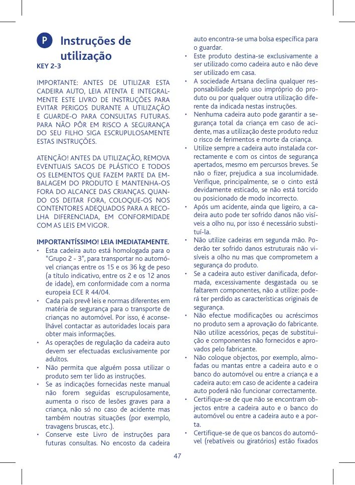 IMPORTANT : Lire attentivement et intÉgralement la notice d’instructions avant de se servir du produit. POUR ÉVITER TOUT RISQUE PENDANT L’UTILISATION, CONSERvER la notice d’instructions POUR POUVOIR VOUS Y RÉFÉRER ULTÉRIEUREMENT. SUIVRE ATTENTIVEMENT CES INSTRUCTIONS POUR NE PAS COMPROMETTRE LA SÉCURITÉ DE VOTRE ENFANT. ATTENTION ! Avant l’utilisation, ENLEVER ET JEter tous les sachets en plastique Éventuels et tous les ÉlÉments composant l’emballage du produit. LES TENIR hors de portÉe deS Enfants. NOUS RECOMMANDONS DE JETER CES ÉLÉMENTS CONFORMEMENT AUX RÉGLEMENTATIONS EN VIGUEUR. TRÈS IMPORTANT ! À LIRE AVANT TOUTE UTILISATION Pour le montage et l’installation du produit, suivre scrupuleusement les instructions. Ne pas utiliser le produit avant d’avoir lu ces instructions. Ce manuel fait partie intégrante du produit. Conserver cette notice dans la poche prévue à cet effet derrière le siège-auto pour pouvoir vous y référer ultérieurement. Ne jamais utiliser ce siège-auto sur les sièges de voiture tournés latéralement ou dos à la route. • Ce siège-auto est homologué “Groupe 2 3”, pour le transport d’enfants d’un poids compris entre 15 et 36 Kg (entre 2 et 12 ans environ), conformément à la norme européenne ECE R 44/04. • Chaque pays a des lois et des règlements différents en matière de sécurité pour le transport des enfants en voiture. Par conséquent, il est conseillé de contacter les autorités locales pour plus d’informations. • Le réglage du siège-auto doit être fait uniquement par un adulte. • Ne pas utiliser ce produit sans avoir préalablement lu les instructions. 20