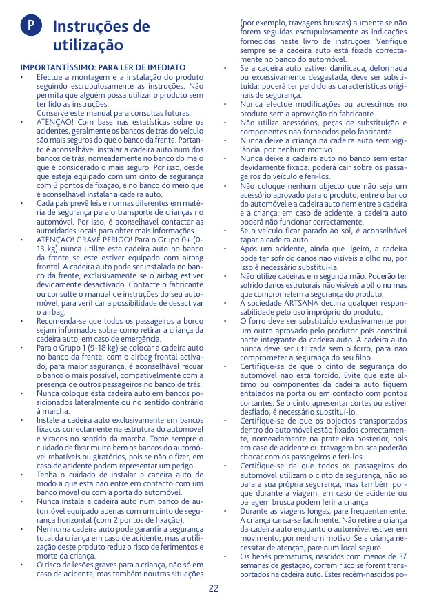 (por exemplo, travagens bruscas) aumenta se não forem seguidas escrupulosamente as indicações fornecidas neste livro de instruções. Verifique sempre se a cadeira auto está fixada correctamente no banco do automóvel. Se a cadeira auto estiver danificada, deformada ou excessivamente desgastada, deve ser substituída: poderá ter perdido as características originais de segurança. Nunca efectue modificações ou acréscimos no produto sem a aprovação do fabricante. Não utilize acessórios, peças de substituição e componentes não fornecidos pelo fabricante. Nunca deixe a criança na cadeira auto sem vigilância, por nenhum motivo. Nunca deixe a cadeira auto no banco sem estar devidamente fixada: poderá cair sobre os passageiros do veículo e feri-los. Não coloque nenhum objecto que não seja um acessório aprovado para o produto, entre o banco do automóvel e a cadeira auto nem entre a cadeira e a criança: em caso de acidente, a cadeira auto poderá não funcionar correctamente. Se o veículo ficar parado ao sol, é aconselhável tapar a cadeira auto. Após um acidente, ainda que ligeiro, a cadeira pode ter sofrido danos não visíveis a olho nu, por isso é necessário substituí-la. Não utilize cadeiras em segunda mão. Poderão ter sofrido danos estruturais não visíveis a olho nu mas que comprometem a segurança do produto. A sociedade ARTSANA declina qualquer responsabilidade pelo uso impróprio do produto. O forro deve ser substituído exclusivamente por um outro aprovado pelo produtor pois constitui parte integrante da cadeira auto. A cadeira auto nunca deve ser utilizada sem o forro, para não comprometer a segurança do seu filho. Certifique-se de que o cinto de segurança do automóvel não está torcido. Evite que este último ou componentes da cadeira auto fiquem entalados na porta ou em contacto com pontos cortantes. Se o cinto apresentar cortes ou estiver desfiado, é necessário substituí-lo. Certifique-se de que os objectos transportados dentro do automóvel estão fixados correctamente, nomeadamente na prateleira posterior, pois em caso de acidente ou travagem brusca poderão chocar com os passageiros e feri-los. Certifique-se de que todos os passageiros do automóvel utilizam o cinto de segurança, não só para a sua própria segurança, mas também porque durante a viagem, em caso de acidente ou paragem brusca podem ferir a criança. Durante as viagens longas, pare frequentemente. A criança cansa-se facilmente. Não retire a criança da cadeira auto enquanto o automóvel estiver em movimento, por nenhum motivo. Se a criança necessitar de atenção, pare num local seguro. Os bebés prematuros, nascidos com menos de 37 semanas de gestação, correm risco se forem transportados na cadeira auto. Estes recém-nascidos po-