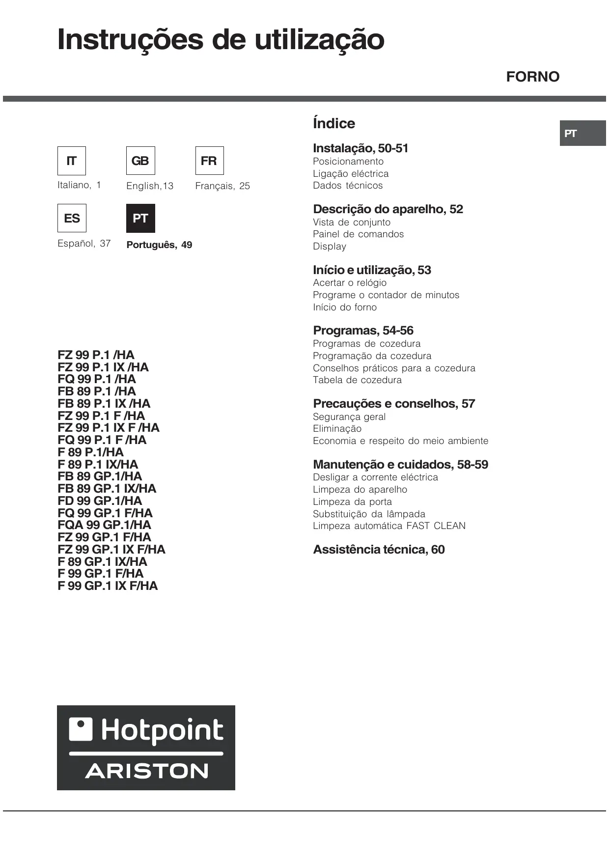 FZ 99 GP.1 F/HA FZ 99 GP.1 IX F/HA F 89 GP.1 IX/HA F 99 GP.1 F/HA F 99 GP.1 IX F/HA Programas de cozedura Programação da cozedura Conselhos práticos para a cozedura Tabela de cozedura Precauções e conselhos, 57 Segurança geral Eliminação Economia e respeito do meio ambiente Manutenção e cuidados, 58-59 Desligar a corrente eléctrica Limpeza do aparelho Limpeza da porta Substituição da lâmpada Limpeza automática FAST CLEAN Assistência técnica, 60