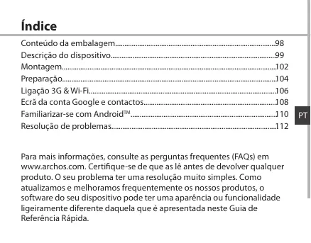 - Resolução de problemas Para mais informações, consulte as perguntas frequentes (FAQs) em www.archos.com. Certifique-se de que as lê antes de devolver qualquer produto. O seu problema ter uma resolução muito simples. Como atualizamos e melhoramos frequentemente os nossos produtos, o software do seu dispositivo pode ter uma aparência ou funcionalidade ligeiramente diferente daquela que é apresentada neste Guia de Referência Rápida. p. 112