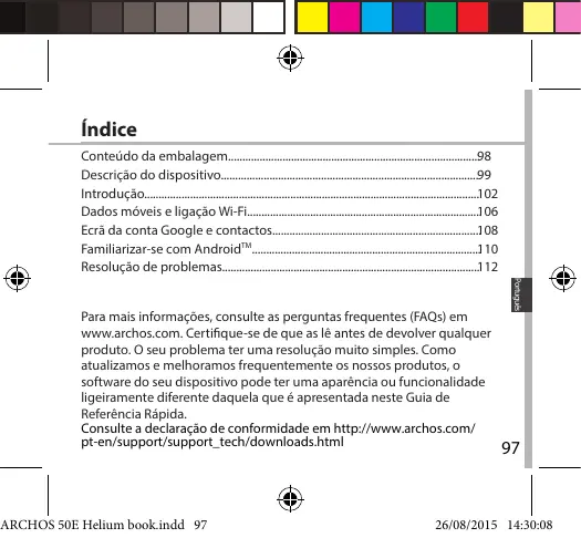 indice Conteüdo da embalagem 28 Descriçäo do dispositivo. 29 Introduçäo. 102 Dados méveise ligaçäo WiFi. 106 Ecrà da conta Google e contactos 108 Famillarizar-se com Android”. 310 & Resoluçäo de problemas. 112 Para mais informaçôes, consulte as perguntas frequentes (FAQS) em wwwarchos.com. Certifique-se de que as lé antes de devoiver qualquer produto. O seu problema ter uma resoluçäo muito simples. Como atualizamos e melhoramos frequentemente os nossos produtos, o software do seu dispositivo pode ter uma aparéncia ou funcionalidade ligeiramente diferente daquela que é apresentada neste Guia de Referéncia Répida. Consulte a declaraçäo de conformidade em http:/ammarchos.com/ pt-en/support/support_tech/downloads html 97