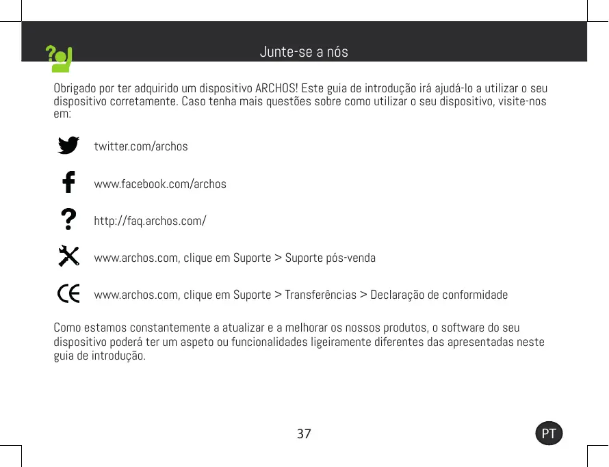 Junte-se a nós Obrigado por ter adquirido um dispositivo ARCHOS! Este guia de introdução irá ajudá-lo a utilizar o seu dispositivo corretamente. Caso tenha mais questões sobre como utilizar o seu dispositivo, visite-nos em: twitter.com/archos www.facebook.com/archos http://faq.archos.com/ www.archos.com, clique em Suporte > Suporte pós-venda www.archos.com, clique em Suporte > Transferências > Declaração de conformidade Como estamos constantemente a atualizar e a melhorar os nossos produtos, o software do seu dispositivo poderá ter um aspeto ou funcionalidades ligeiramente diferentes das apresentadas neste guia de introdução.