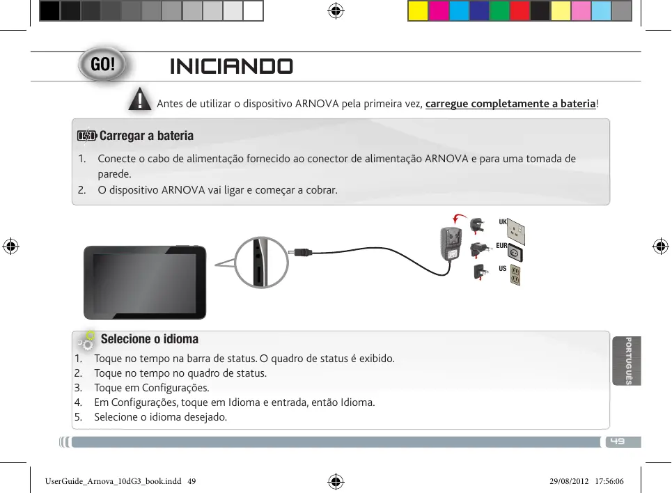 INICIANOO À Antes de utilizar o dispositivo ARNOVA pela primeira vez, carregue completamente a bateria! ŒD Carregar a bateria
