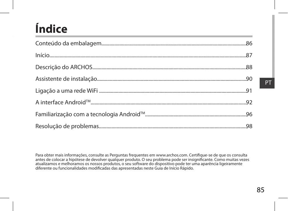 - Resolução de problemas Para obter mais informações, consulte as Perguntas frequentes em www.archos.com. Certifique-se de que os consulta antes de colocar a hipótese de devolver qualquer produto. O seu problema pode ser insignificante. Como muitas vezes atualizamos e melhoramos os nossos produtos, o seu software do dispositivo pode ter uma aparência ligeiramente diferente ou funcionalidades modificadas das apresentadas neste Guia de Início Rápido. p. 98