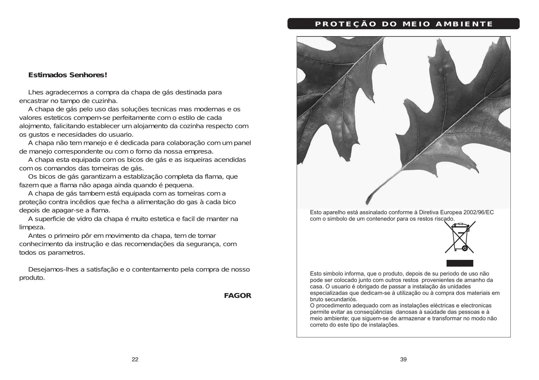 Estimados Senhores! Lhes agradecemos a compra da chapa de gás destinada para encastrar no tampo de cuzinha. A chapa de gás pelo uso das soluções tecnicas mas modernas e os valores esteticos compem-se perfeitamente com o estilo de cada alojmento, falicitando establecer um alojamento da cozinha respecto com os gustos e necesidades do usuario. A chapa não tem manejo e é dedicada para colaboração com um panel de manejo correspondente ou com o forno da nossa empresa. A chapa esta equipada com os bicos de gás e as isqueiras acendidas com os comandos das torneiras de gás. Os bicos de gás garantizam a establização completa da flama, que fazem que a flama não apaga ainda quando é pequena. A chapa de gás tambem está equipada com as torneiras com a proteção contra incêdios que fecha a alimentação do gas à cada bico depois de apagar-se a flama. A superficie de vidro da chapa é muito estetica e facil de manter na limpeza. Antes o primeiro pôr em movimento da chapa, tem de tomar conhecimento da instrução e das recomendações da segurança, com todos os parametros. Desejamos-lhes a satisfação e o contentamento pela compra de nosso produto. FAGOR