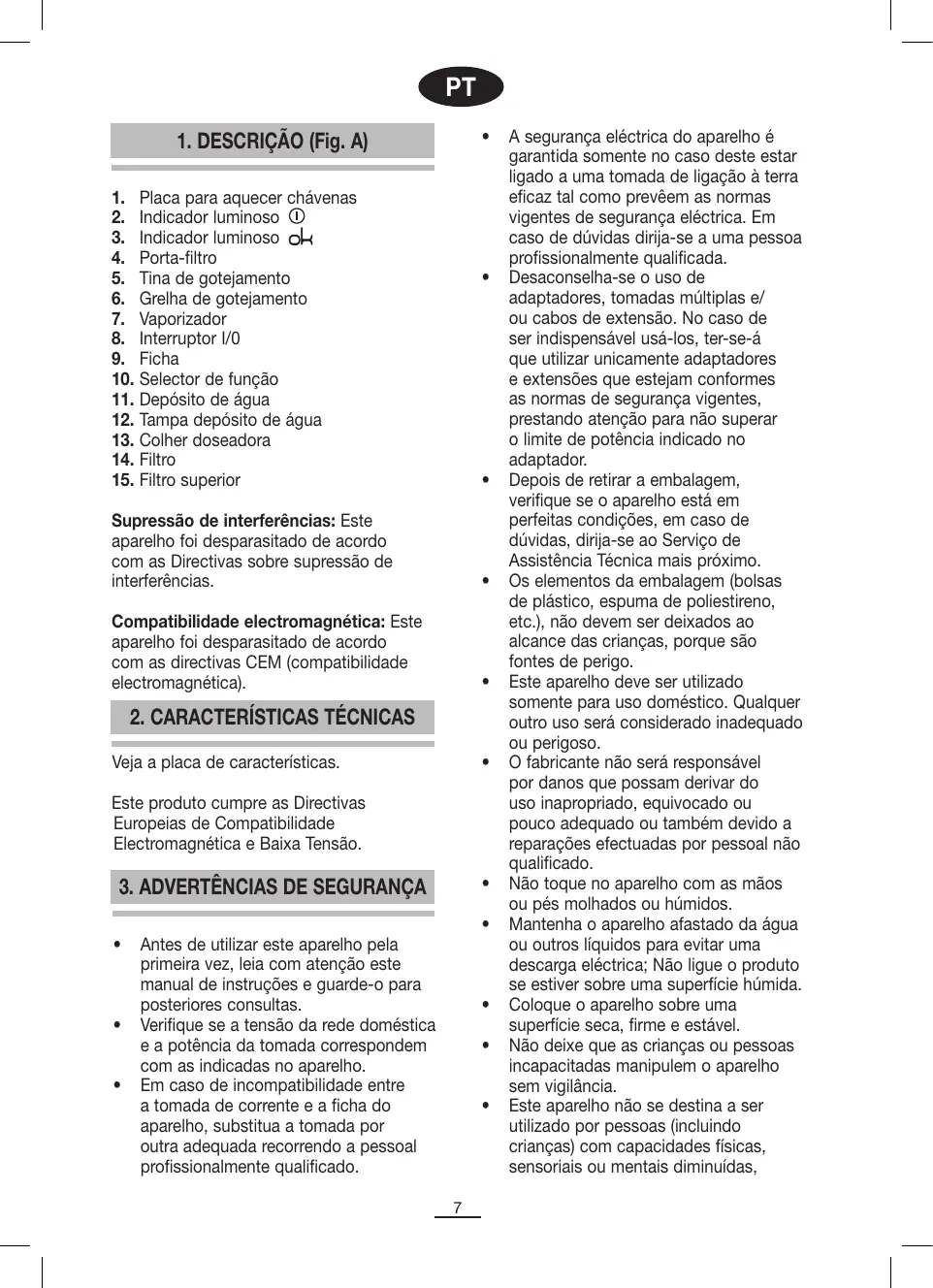 ou com falta de experiência ou conhecimentos, excepto quando supervisionadas ou instruídas, relativamente à utilização do aparelho, por uma pessoa responsável pela sua segurança. As crianças devem ser mantidas sob vigilância para garantir que não brincam com o aparelho. Para uma maior protecção, recomendase a instalação de um dispositivo de corrente residual (RCD) com uma corrente residual operacional que não supere os 30 mA. Aconselhe-se com o técnico de instalação. Não abandonar o aparelho aceso porque pode ser fonte de perigo. Ao desligar a cavilha nunca puxe do cabo. Desligue o aparelho antes de efectuar qualquer operação de limpeza ou manutenção. Em caso de avaria ou mau funcionamento do aparelho e sempre que não o utilizar, desligue-o e não o repare. No caso de necessitar de reparação dirigir-se unicamente a um Serviço de Assistência Técnica autorizado pelo fabricante e solicitar o uso de peças de substituição originais. Se o cabo deste aparelho estiver danificado, dirija-se a um Centro de Assistência técnico autorizado para que o substituam. Não deixe o aparelho exposto aos agentes atmosféricos (chuva, sol, gelo etc.). Não utilize ou coloque nenhuma parte deste aparelho sobre ou próximo de superfícies quentes (placas de cozinha de gás ou eléctrica, fornos). Não utilize detergentes ou baetas abrasivas para limpar a unidade. Não toque as superfícies quentes. Utilize as pegas ou flexores. Evite que o cabo toque nas partes quentes do aparelho. Não colocar em funcionamento o aparelho sem água no depósito. Não aquece líquidos inflamáveis com o vaporizador. A tina de gotejamento e a grelha devem