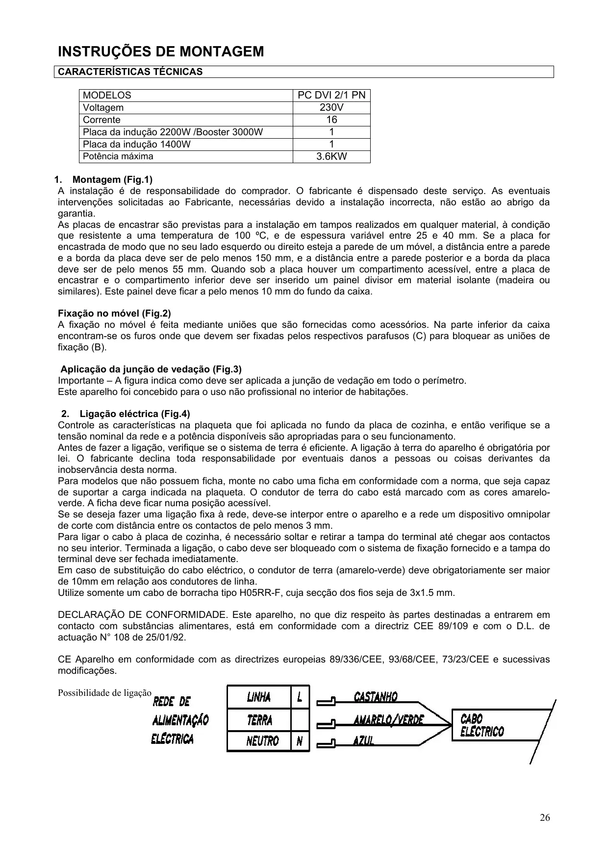 Controle as características na plaqueta que foi aplicada no fundo da placa de cozinha, e então verifique se a tensão nominal da rede e a potência disponíveis são apropriadas para o seu funcionamento. Antes de fazer a ligação, verifique se o sistema de terra é eficiente. A ligação à terra do aparelho é obrigatória por lei. O fabricante declina toda responsabilidade por eventuais danos a pessoas ou coisas derivantes da inobservância desta norma. Para modelos que não possuem ficha, monte no cabo uma ficha em conformidade com a norma, que seja capaz de suportar a carga indicada na plaqueta. O condutor de terra do cabo está marcado com as cores amareloverde. A ficha deve ficar numa posição acessível. Se se deseja fazer uma ligação fixa à rede, deve-se interpor entre o aparelho e a rede um dispositivo omnipolar de corte com distância entre os contactos de pelo menos 3 mm. Para ligar o cabo à placa de cozinha, é necessário soltar e retirar a tampa do terminal até chegar aos contactos no seu interior. Terminada a ligação, o cabo deve ser bloqueado com o sistema de fixação fornecido e a tampa do terminal deve ser fechada imediatamente. Em caso de substituição do cabo eléctrico, o condutor de terra (amarelo-verde) deve obrigatoriamente ser maior de 10mm em relação aos condutores de linha. Utilize somente um cabo de borracha tipo H05RR-F, cuja secção dos fios seja de 3x1.5 mm. DECLARAÇÃO DE CONFORMIDADE. Este aparelho, no que diz respeito às partes destinadas a entrarem em contacto com substâncias alimentares, está em conformidade com a directriz CEE 89/109 e com o D.L. de actuação N° 108 de 25/01/92. CE Aparelho em conformidade com as directrizes europeias 89/336/CEE, 93/68/CEE, 73/23/CEE e sucessivas modificações. Possibilidade de ligação