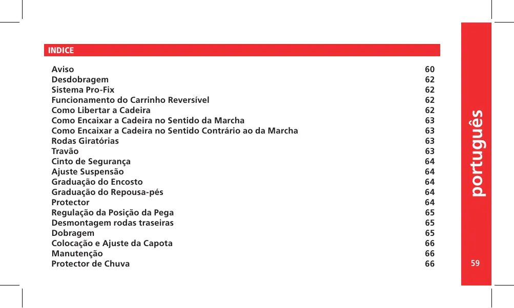 Leia estas instruções atentamente antes da utilização e guarde-as para futura referência. A segurança da sua criança pode ser afectada se não seguir estas instruções. Este carrinho destina-se a crianças desde os 6 meses de idade até aos 15 kg. Apto para bebés menores de 6 meses unicamente com acessórios aprovados pela JANÉ. Guarde este manual de instruções para futuras consultas. AVISO: Pode ser perigoso deixar o seu bebé sozinho. AVISO: Assegure-se de que todos os dispositivos de segurança estão correctamente accionados antes de cada utilização. AVISO: Utilizar um cinto, assim que a criança consiga sentar-se sozinha. AVISO: Este assento não é destinado a crianças menores de 6 meses. AVISO: Qualquer peso extra colocado na(s) pega(s) afecta a estabilidade do carrinho/alcofa. AVISO: Usar sempre o conto de entre pernas em combinação com o de cintura. AVISO: Verificar que os dispositivos de fixação da alcofa ou do assento se encontram correctamente apertados antes da utilização. AVISO: Este produto não foi desenhado para correr ou patinar. A massa máxima permitida do cesto porta-objectos nunca pode ultrapassar o indicado no cesto (4 kg). Este carrinho só pode ser utilizado por uma criança. Nunca utilize acessórios que não tenham sido aprovados pela JANÉ, S.A. Os dois pontos de fixação laterais do assento podem ser utilizados para a fixação de um arnês suplementar (ver ponto 9 ). AVISO: Nunca permita que a criança se ponha de pé no repousa-pés o estribo. AVISO: É imprescindível assegurar-se que a criança se mantém afastada da cadeira durante as acções de dobragem e desdobragem. A aparição de pontos de corte e compressão e entalamentos é inevitável durante estas operações. AVISO: Uma vez accionado o travão, certifique-se que o carrinho ficou correctamente travado. Pode ser necessário fazer rodar ligeiramente o carrinho para que o travão engrene de forma óptima. AVISO: Nunca deixe a criança no carrinho no momento de subir e descer escadas ou ao viajar em algum meio de transporte. AVISO: Não colocar peso sobre a capota. português AVISO: A criança deve manter-se afastada das partes móveis quando estas estiverem a ser manipuladas pelo adulto responsável. A aparição de pontos de corte e compressão e entalamentos é inevitável durante estas operações.