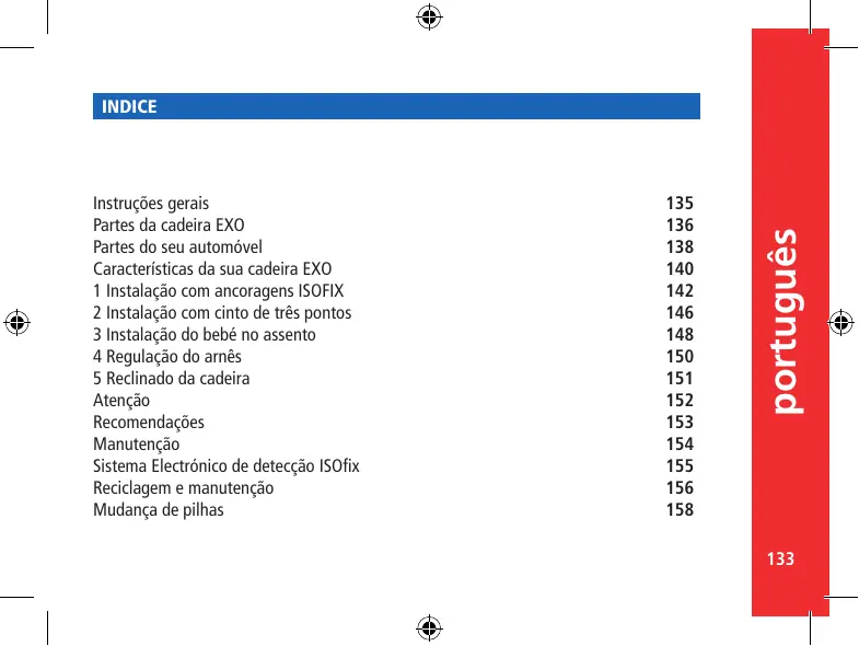 Instruções gerais Partes da cadeira EXO Partes do seu automóvel Características da sua cadeira EXO 1 Instalação com ancoragens ISOFIX 2 Instalação com cinto de três pontos 3 Instalação do bebé no assento 4 Regulação do arnês 5 Reclinado da cadeira Atenção Recomendações Manutenção Sistema Electrónico de detecção ISOfix Reciclagem e manutenção Mudança de pilhas
