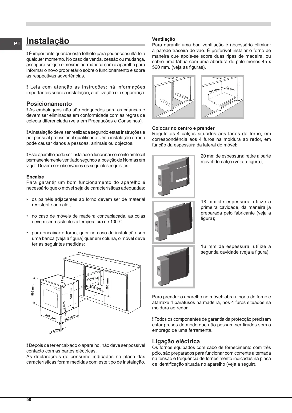 Instalação ! É importante guardar este folheto para poder consultá-lo a qualquer momento. No caso de venda, cessão ou mudança, assegure-se que o mesmo permanece com o aparelho para informar o novo proprietário sobre o funcionamento e sobre as respectivas advertências. Ventilação Para garantir uma boa ventilação é necessário eliminar a parede traseira do vão. É preferível instalar o forno de maneira que apoie-se sobre duas ripas de madeira, ou sobre uma tábua com uma abertura de pelo menos 45 x 560 mm. (veja as figuras). ! Leia com atenção as instruções: há informações importantes sobre a instalação, a utilização e a segurança.