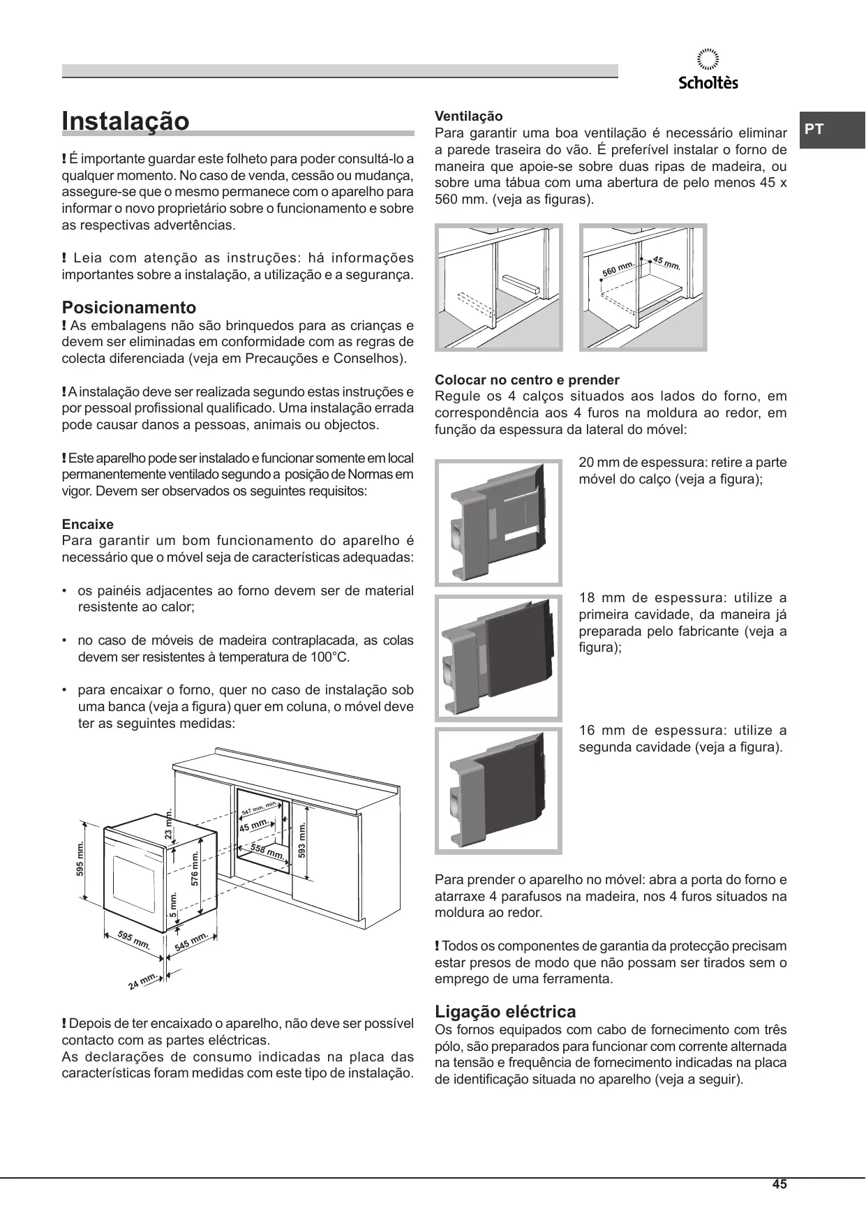 - Presente sólo en algunos modelos. Instalação ! É importante guardar este folheto para poder consultá-lo a qualquer momento. No caso de venda, cessão ou mudança, assegure-se que o mesmo permanece com o aparelho para informar o novo proprietário sobre o funcionamento e sobre as respectivas advertências. Ventilação Para garantir uma boa ventilação é necessário eliminar a parede traseira do vão. É preferível instalar o forno de maneira que apoie-se sobre duas ripas de madeira, ou sobre uma tábua com uma abertura de pelo menos 45 x 560 mm. (veja as figuras). ! Leia com atenção as instruções: há informações importantes sobre a instalação, a utilização e a segurança.