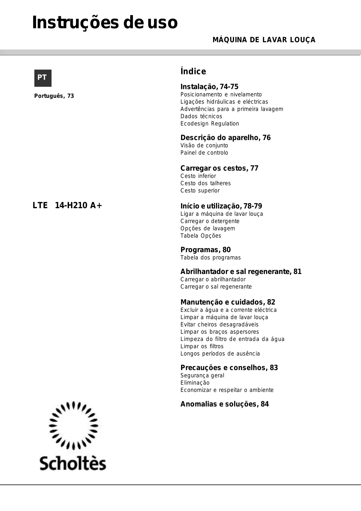 LTE 14-H210 A - Máquinas de lavar loiça SCHOLTES - Manual de utilização gratuito